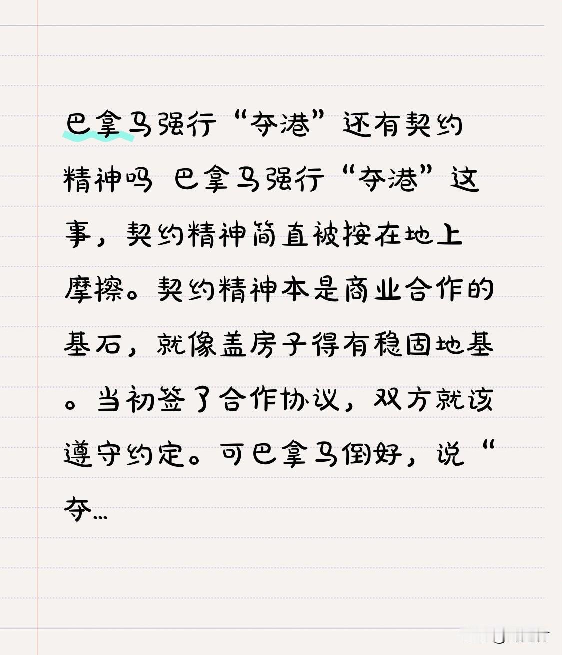 巴拿马强行“夺港”还有契约精神吗 巴拿马强行“夺港”,何来契约精神? 巴拿马强行“夺港”,肆意践踏了契约精神。契约精神是商业合作的基石,正如建房需要稳固的地基。 当初签订合作协议,双方本应遵守约定。但巴拿马说“夺港”就“夺港”,这如同与人合伙开公司,前期大家按合同各司其职,对方却突然翻脸独占公司。 这种行为严重破坏商业信誉。此后谁还敢与巴拿马好好合作?说不定哪天又被“夺”走。商业世界若没了契约精神,就会混乱不堪,人人提心吊胆,损失远不止一个港口。