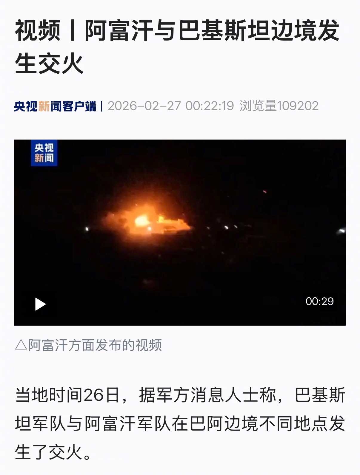 【#阿富汗与巴基斯坦边境发生交火# 】当地时间26日,据军方消息人士称,巴基斯坦军队与阿富汗军队在巴阿边境不同地点发生了交火。#阿富汗巴基斯坦回应边境交火##巴基斯坦否认与阿交火中有士兵丧生#