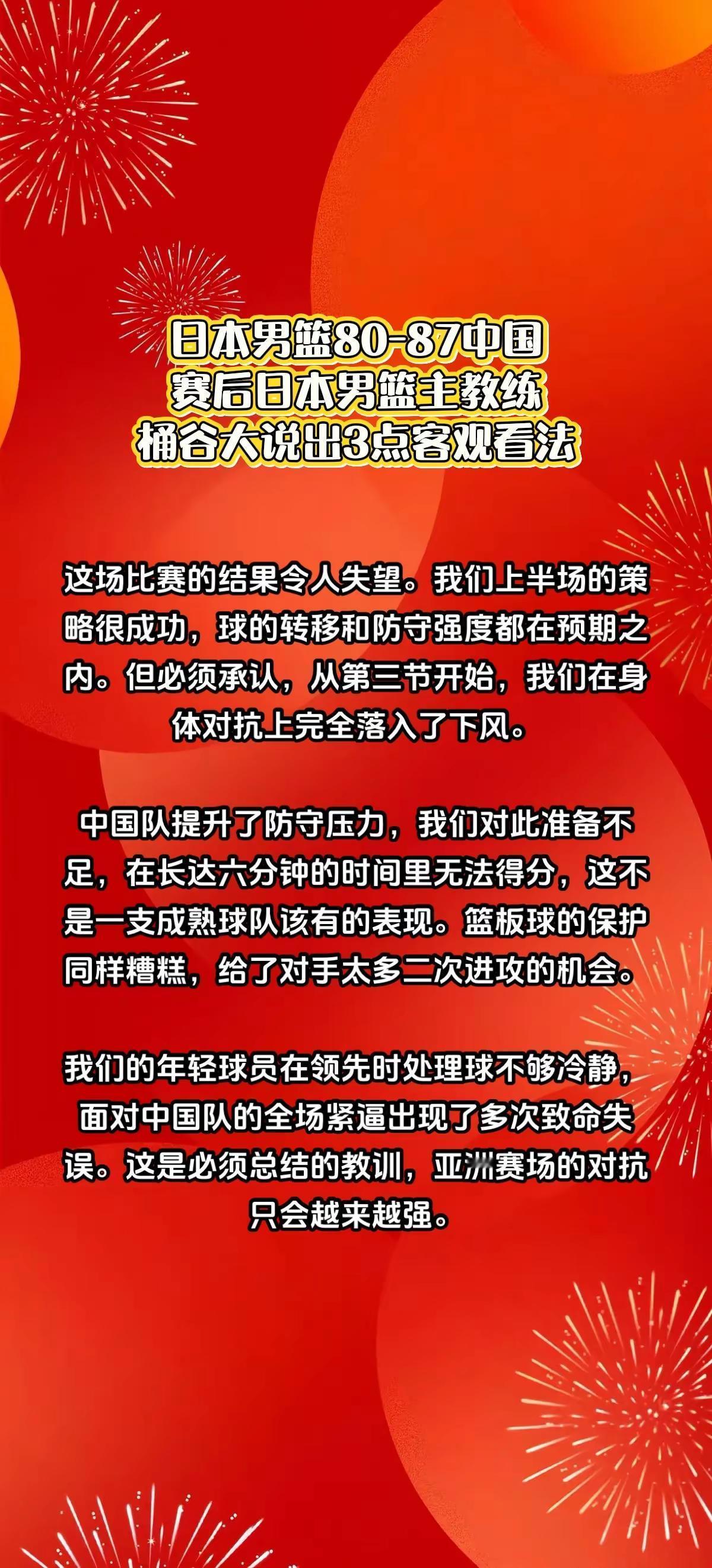 日本男篮80-87中国,桶谷大说出3点。日本男篮中国男