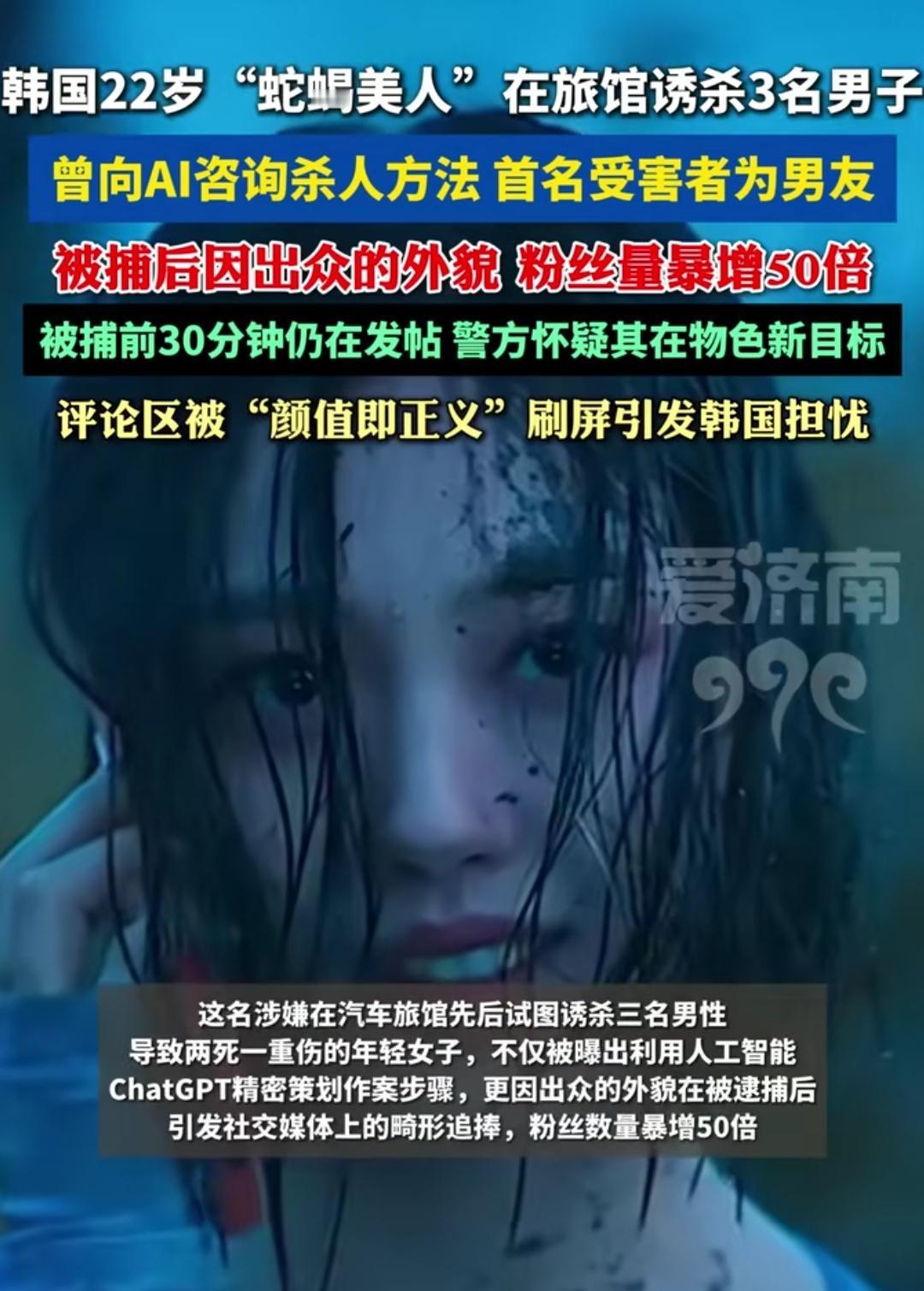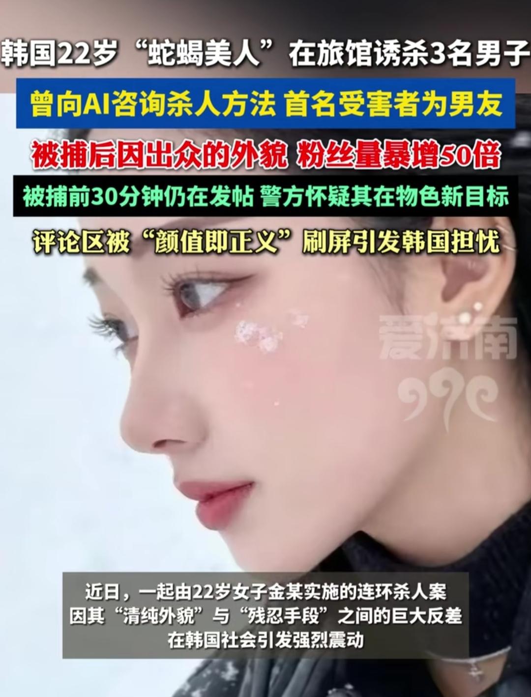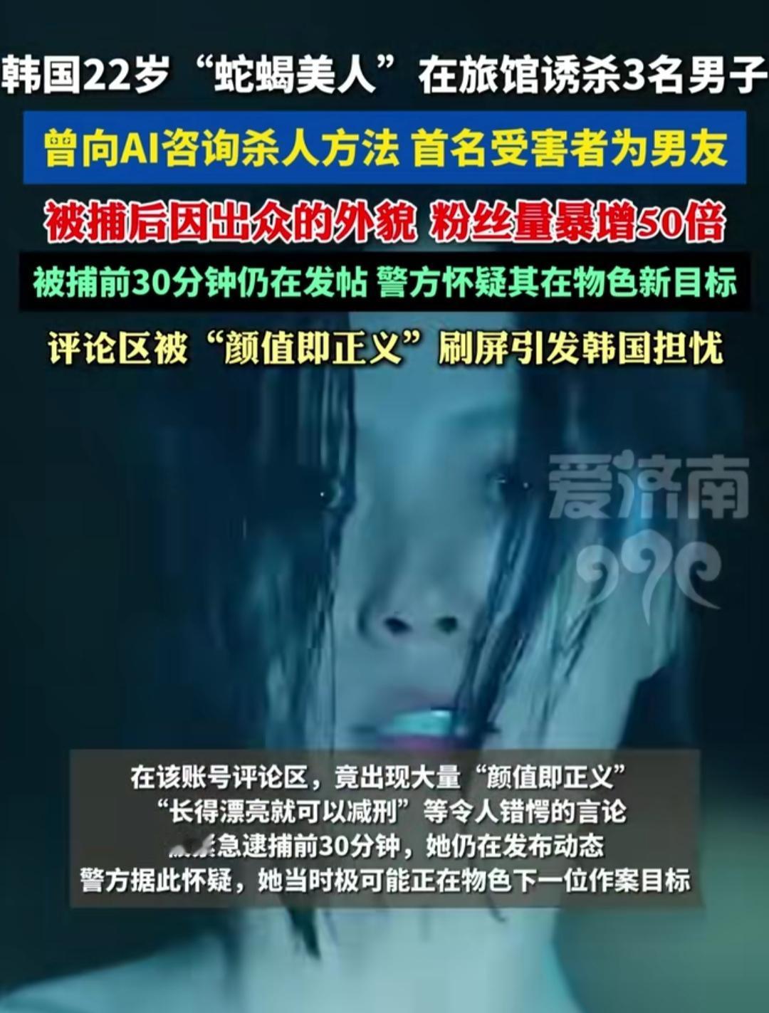 真的不敢相信,颜值和人性的割裂能到这种程度!韩国22岁女子因涉嫌诱杀男子被捕,被网友称作“蛇蝎美人”,光是看到这个称呼,就让人心里揪了一下,好看的皮囊下,藏着的竟是如此冰冷的心思。 她把作案地点选在旅馆,用掺药饮料对男性下手,首名受害者还是她的男友,更让人脊背发凉的是,她竟曾向AI咨询杀人方法,案件酿成了2死1伤的悲剧,可被捕后她的社交账号粉丝却暴涨了50倍。 很难想象受害者家属得知真相时的崩溃,一条鲜活的生命落幕,换来的却是有人因颜值对嫌犯的畸形追捧。这起案件不仅牵扯出可怕的作案细节,更折射出当下的一种社会现象,值得所有人静下心来好好思考。