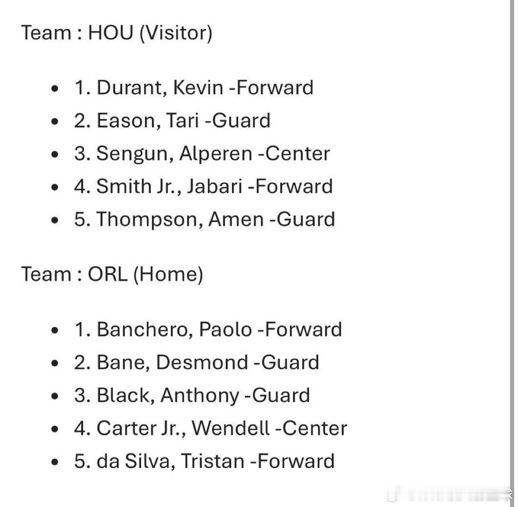 1. 凯文·杜兰特 - 前锋2. 塔里·伊森 - 后卫3. 阿尔佩伦·申京 - 中锋4. 小贾巴里·史密斯 - 前锋5. 阿门·汤普森 - 后卫
