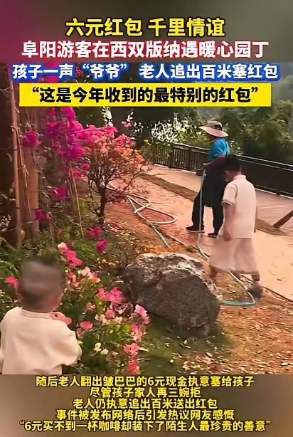 泪目!一位游客的孩子,因为喊了一声酒店门口给花草浇水的园林工“爷爷”,这个爷爷执意要给孩子6元红封,游客不收,园林工的一番话令游客破防:“他喊我爷爷是看得起我!” 平凡的人心里藏着最柔软的善意,一句简单的称呼,就能让他记在心里,想要拿出全部的心意回馈。 很多人习惯用身份和职业去评判他人,却忘了每一个认真生活的人,都值得被尊重和善待。 孩子的世界没有高低贵贱,一声爷爷纯粹又真诚,恰好戳中了老人心底最渴望的温暖。 六块钱不多,却比任何贵重的礼物都珍贵,这是普通人之间最朴素的情感碰撞。 我们总在追求宏大的感动,却忽略了生活里这些细碎的温柔,最能打动人心。 职业没有高低,人格不分贵贱,真诚的尊重,永远能换来最滚烫的真心。 这份小小的互动,照见了人性的美好,也提醒着每一个人,善待身边每一个平凡的身影。