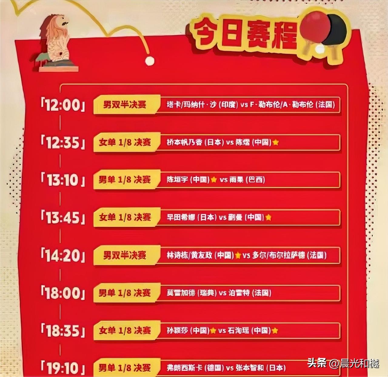 今日新加坡大满贯赛程: 一、陈熠VS桥本帆乃香 二、陈垣宇VS雨果 三、蒯曼VS早田希娜 四、林诗栋/黄友政男双 五、孙颖莎VS石洵瑶 浅析一下国乒队员的比赛: 陈熠重点在心态要稳,不主动失误去跟桥本多帆几个回合、让乃香不起来; 陈垣宇碰上雨果,就拿出光脚不怕穿鞋的气势来,不患得患失就是拼出去; 蒯曼陈熠在女双上输给了早田张本美和,在女单上大丫头可不怕早田希娜; 混双和女双都无缘争冠了,仅剩下了男子双打还有指望,诗友组合要硬朗; 孙颖莎与石洵瑶的国乒队友之争,考验的是莎莎的鞋和脚,冲击的是小石。
