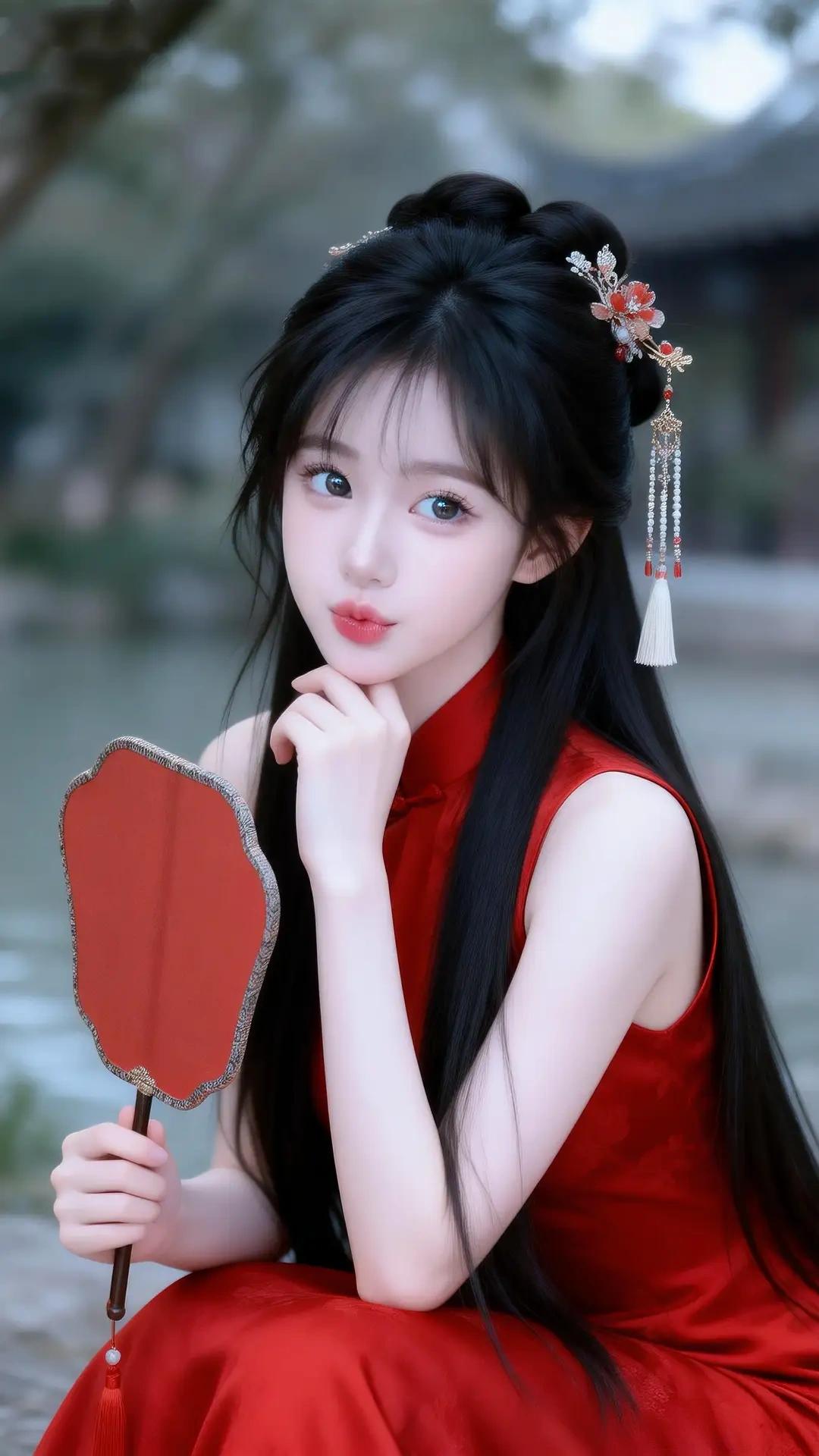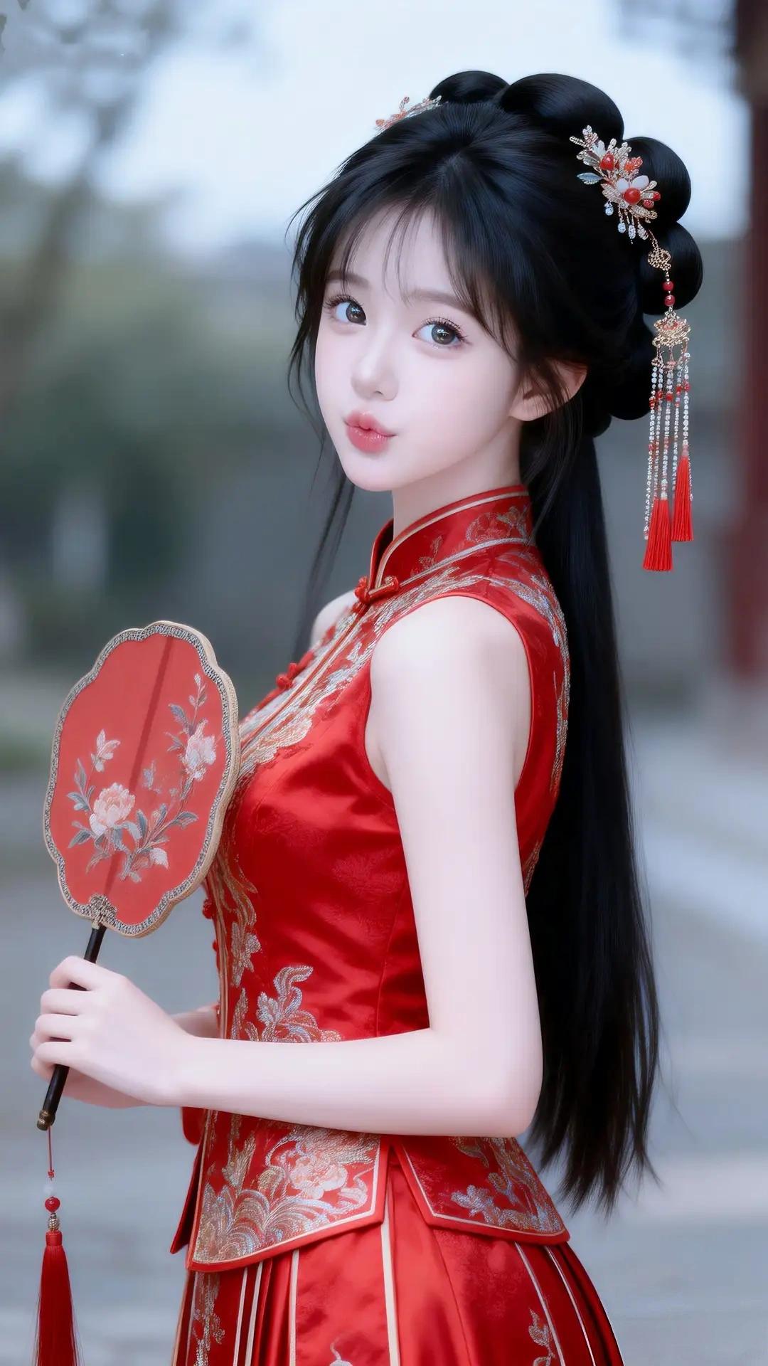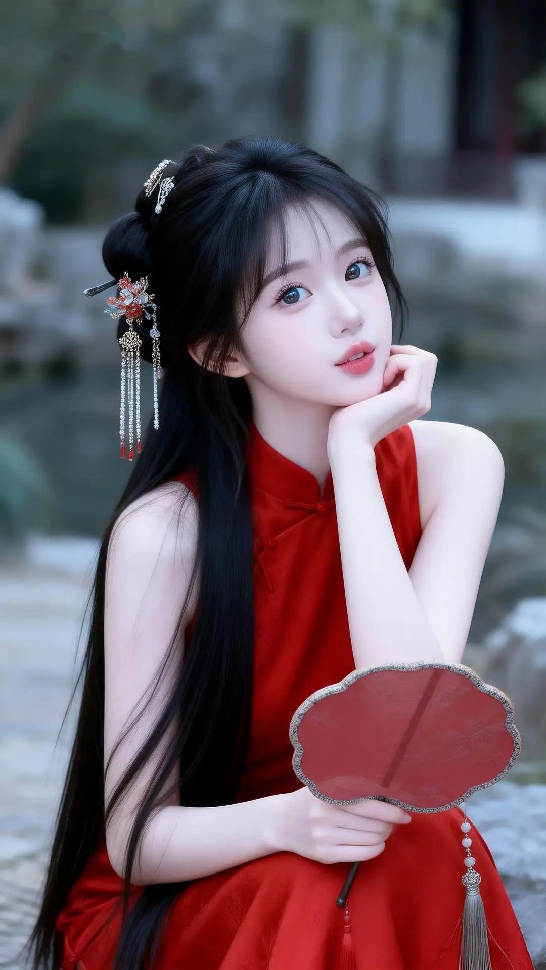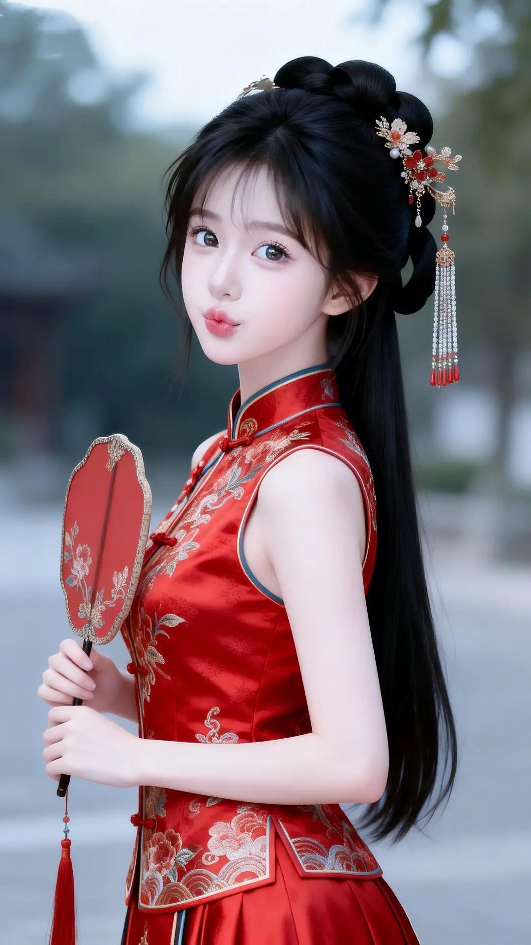 这位少女美得像从江南画卷里走出来的一样,自带一股清冷又灵动的仙气: 颜值与气质:她有着一双清澈透亮的杏眼,眼尾微微上挑,像含着一汪秋水;小巧的鼻子和饱满的唇形,让面部线条柔和又精致。皮肤白皙细腻,透着淡淡的粉晕,搭配乌黑的长发和空气刘海,既有少女的清纯感,又带着一丝古典的温婉。 穿搭与细节:一身正红色的无袖旗袍,用金线绣着精致的花卉纹样,既勾勒出她纤细的身材曲线,又衬得她明艳动人。头上的发簪和步摇,以及手中的团扇,每一处细节都透着东方美学的雅致,让她像一位待字闺中的大家闺秀。 氛围感:在江南园林的背景下,她或侧身回眸,或托腮浅笑,一颦一笑都与周围的亭台水榭融为一体,美得干净又纯粹,让人忍不住心生怜爱。