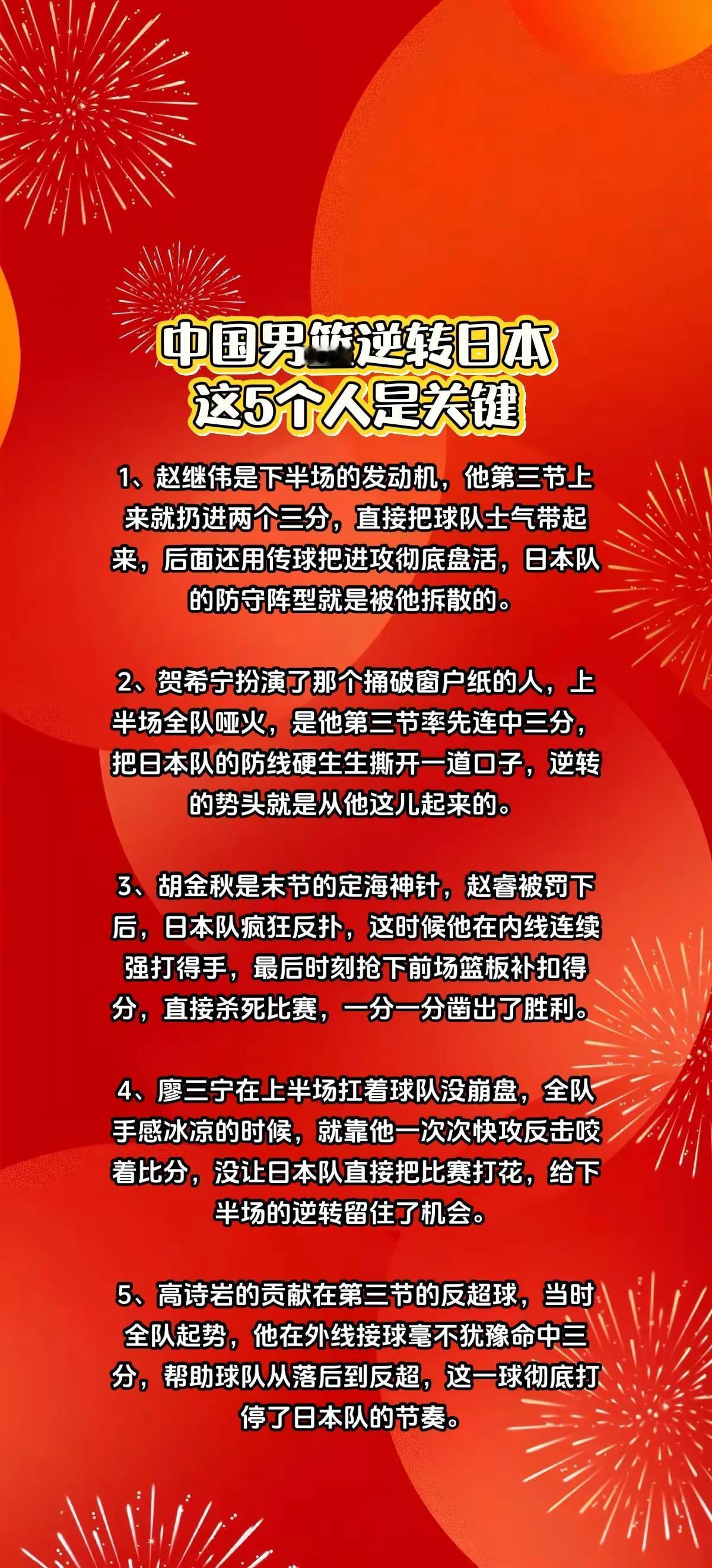 中国男篮逆转日本,这5个人是绝对的关键。中国男篮