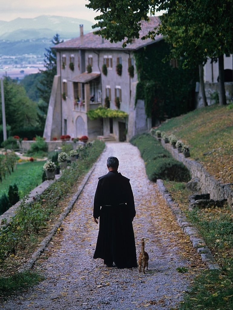 方济各会修道士和猫,意大利,列蒂的圣玛丽亚德拉福雷斯塔保护区。2004年。