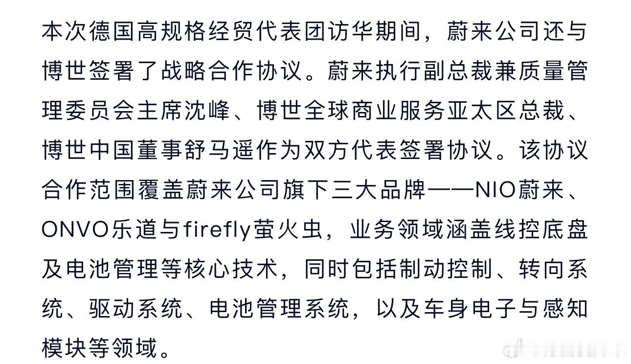 蔚来与博世达成战略合作协议,该协议合作范围覆盖蔚来公司旗下蔚来、乐道、萤火虫三大品牌。
