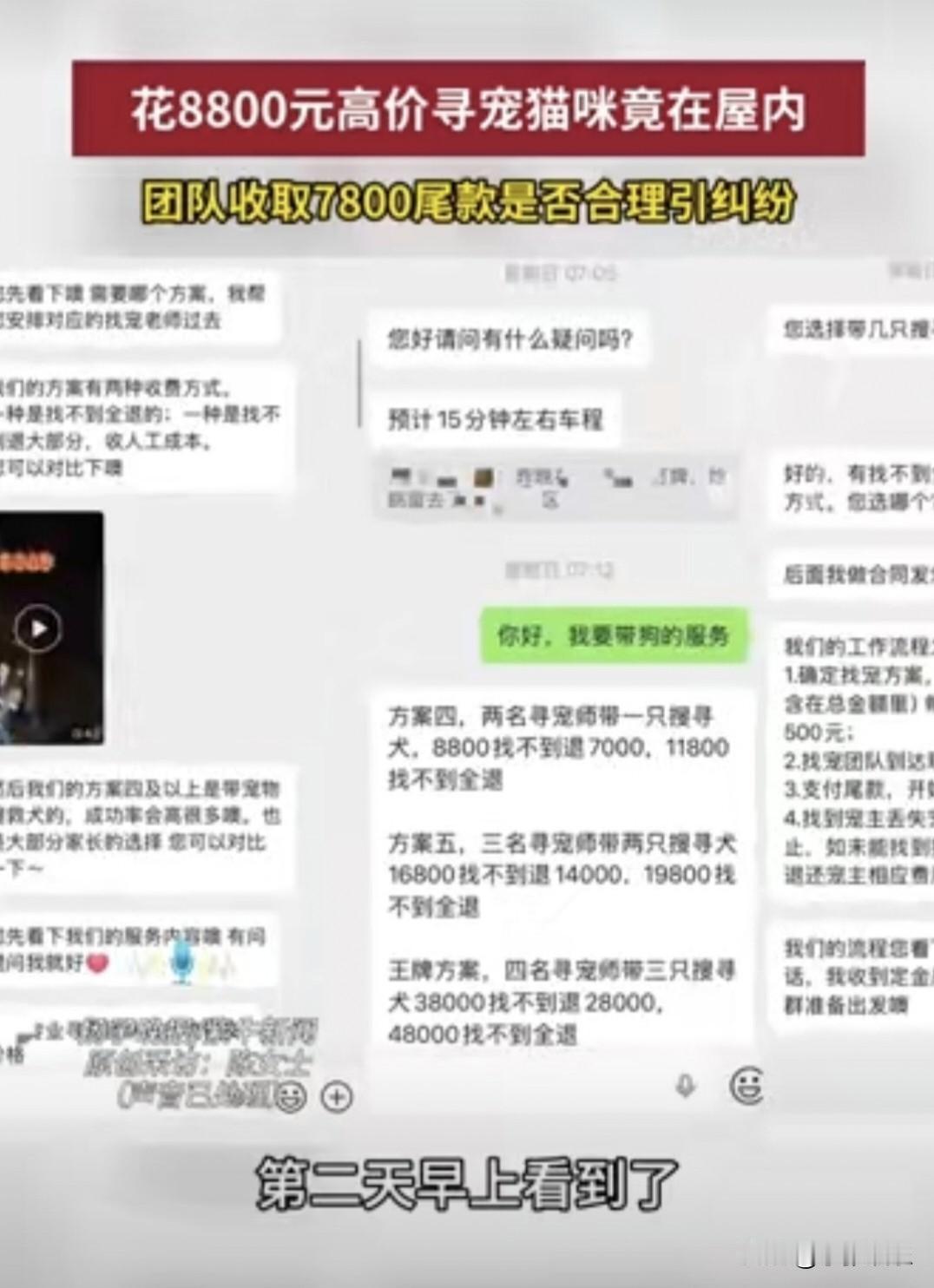 花8800元寻猫,猫竟没丢!商家咬死不退钱,这钱到底该不该退? 上海陈女士这波操作,简直是2026开年最冤大种! 谁能想到,急到团团转花8800元请专业团队找猫,折腾2个半小时,最后发现猫压根没出门,就在办公室桌底下躲着! 更气人的是,寻宠团队收完钱直接摆烂:一分不退! 当天陈女士发现猫咪不见,瞬间慌了神。爱宠如命的她,第一时间在网上找了家口碑不错的寻宠团队。 对方拍着胸脯保证:专业设备、经验丰富、成功率超高! 一听能快速找回猫,陈女士想都没想,先转了1000元定金。 团队刚上门,还没开始正式搜寻,就催着要7800元尾款。救猫心切的陈女士,咬咬牙把钱全付了,总计8800元。 本以为花了大价钱,能享受到VIP级搜救服务。 结果呢? 团队就在小区里随便转了转,走走停停,全程敷衍了事,完全是遛狗式搜寻! 陈女士越看越心凉,自己也在办公室里反复找。 就在搜寻进行到2个半小时时,物业工作人员一句话点醒梦中人:猫没丢,就在你办公室桌子底下! 陈女士冲过去一看,猫咪正安安稳稳躲在角落,一脸无辜。 那一刻,她又气又笑,差点原地崩溃! 猫找到了,可不是寻宠团队的功劳。陈女士立刻联系对方,要求退还7800元尾款,只愿意支付合理的辛苦费。 没想到,商家态度强硬到离谱:按结果收费,不管谁找到,一律不退钱! 他们还拿出合同,里面居然写着:任何人找到都算团队成功,费用一分不退! 这简直是霸王条款啊! 陈女士彻底怒了,已经报警处理,还委托律师准备起诉,非要讨个公道不可! 事件曝光后,网友直接炸锅,评论区吵翻了天: “**8800元找猫,猫自己藏起来了,商家凭啥不退钱?**这钱赚得良心不痛吗?” “**明显是割韭菜!**焦虑时刻坑钱,最恶心这种无良商家!” “合同全是陷阱,不管谁找到都算他们的,这不是明抢吗?” “支持维权!必须整治寻宠行业乱象,别让老实人吃亏!” 也有少数人觉得,团队毕竟出了力,该给点辛苦费,但全款不退绝对不合理。 这事看似是一场寻猫乌龙,实则撕开了高价寻宠行业的遮羞布。 如今宠物经济火爆,寻宠服务水涨船高,收费从几千到几万不等。很多机构打着专业、高效的旗号,实际服务大打折扣,合同里全是坑,专挑主人着急焦虑的时候下手。 花大价钱买安心,最后却成了任人宰割的冤种。 我们心疼毛孩子,更该守住自己的钱包。遇到宠物走失,先冷静仔细搜寻,别被焦虑冲昏头脑。选择服务时,一定要看清资质、盯紧合同、留存证据,别让霸王条款钻了空子。 猫没丢,商家没起到关键作用,8800元到底该不该退?你支持陈女士维权到底吗?