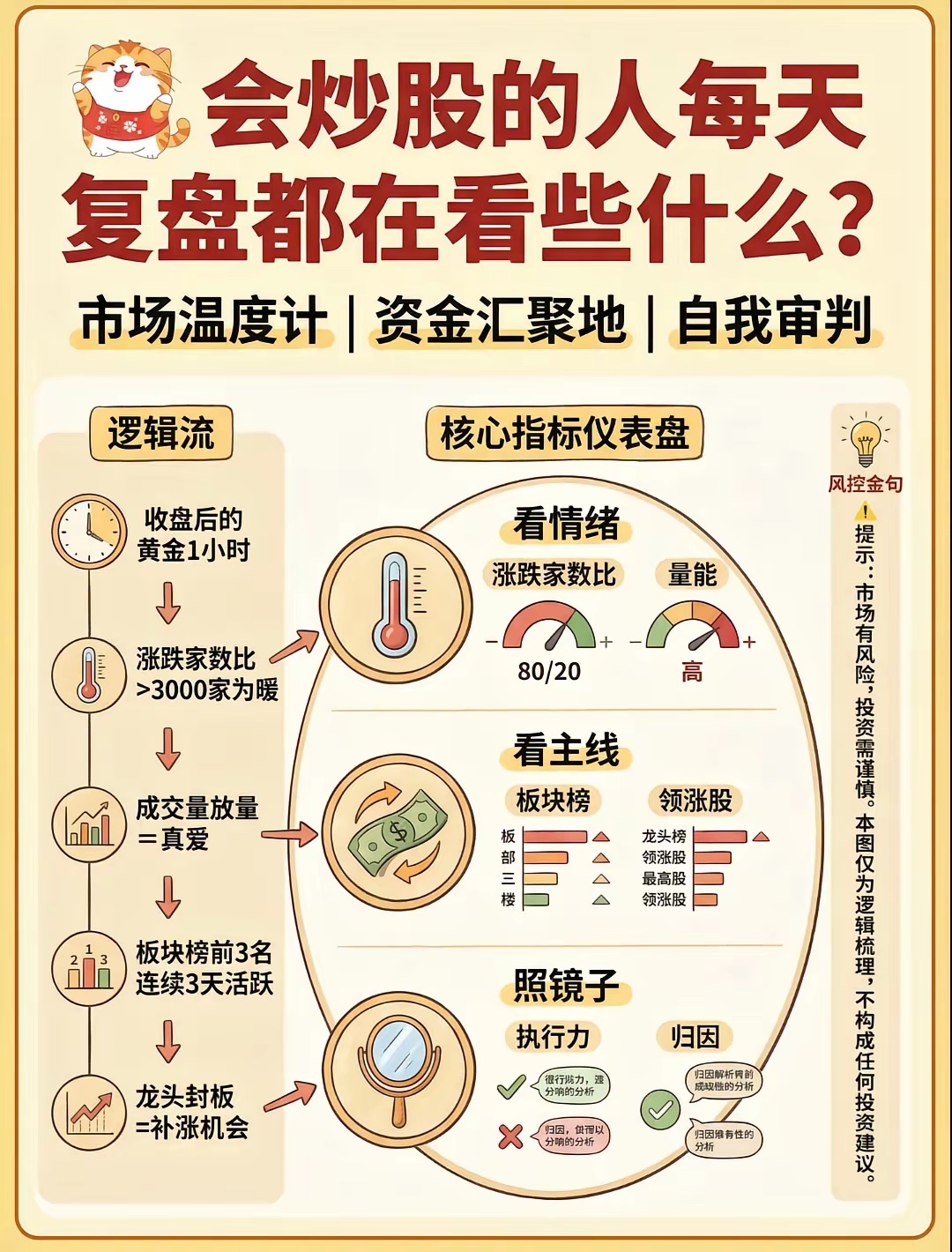 真正的高手,从不在盘中追涨杀跌,而是在盘后用1小时,把市场的脉搏摸得清清楚楚。看涨跌家数判断市场温度,用量能感知资金热度,从板块榜里锁定主线,再从领涨股里找到龙头。最后对着镜子复盘:执行力够不够?盈亏的归因对不对?把每一次交易都变成可复制的经验,这才是复利的开始。