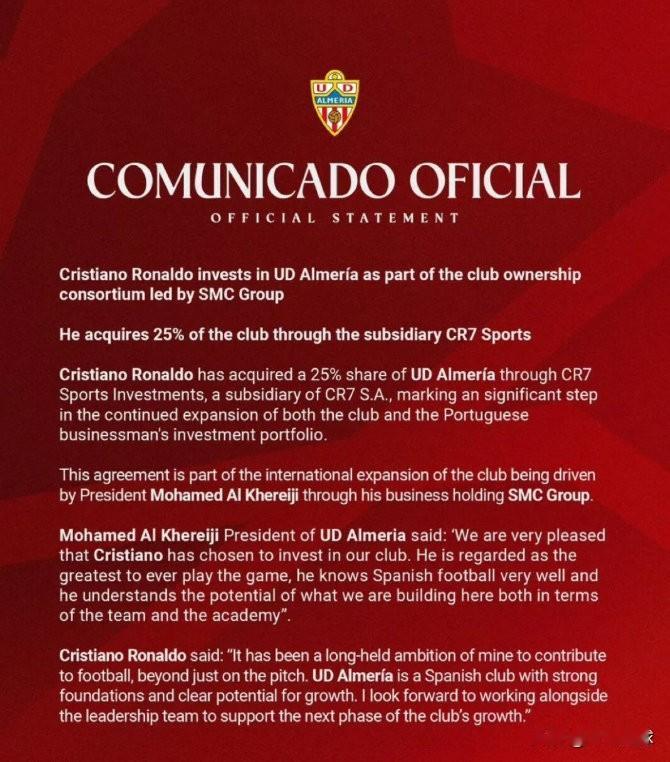 C罗收购西乙阿尔梅里亚25%股份,或将以球员+老板的身份回归西甲! 近日,西乙阿尔梅里亚官宣,C罗通过CR7 S.A集团的子公司Sports Investments完成了对该俱乐部25%股权的收购。目前,阿尔梅里亚在西乙27轮过后排名第三,仅落后榜首桑坦德竞技2分,冲甲在望。 C罗此番操作肯定是为未来退役转型做准备,但是也不排除借机回归欧洲主流赛场,41岁依旧是敢打敢拼的年纪。想象下,2026/2027赛季,C罗身穿阿尔梅里亚7号球衣在西甲联赛对阵皇马、巴萨,并完成个人千球大业,将是怎样的场景,拭目以待!