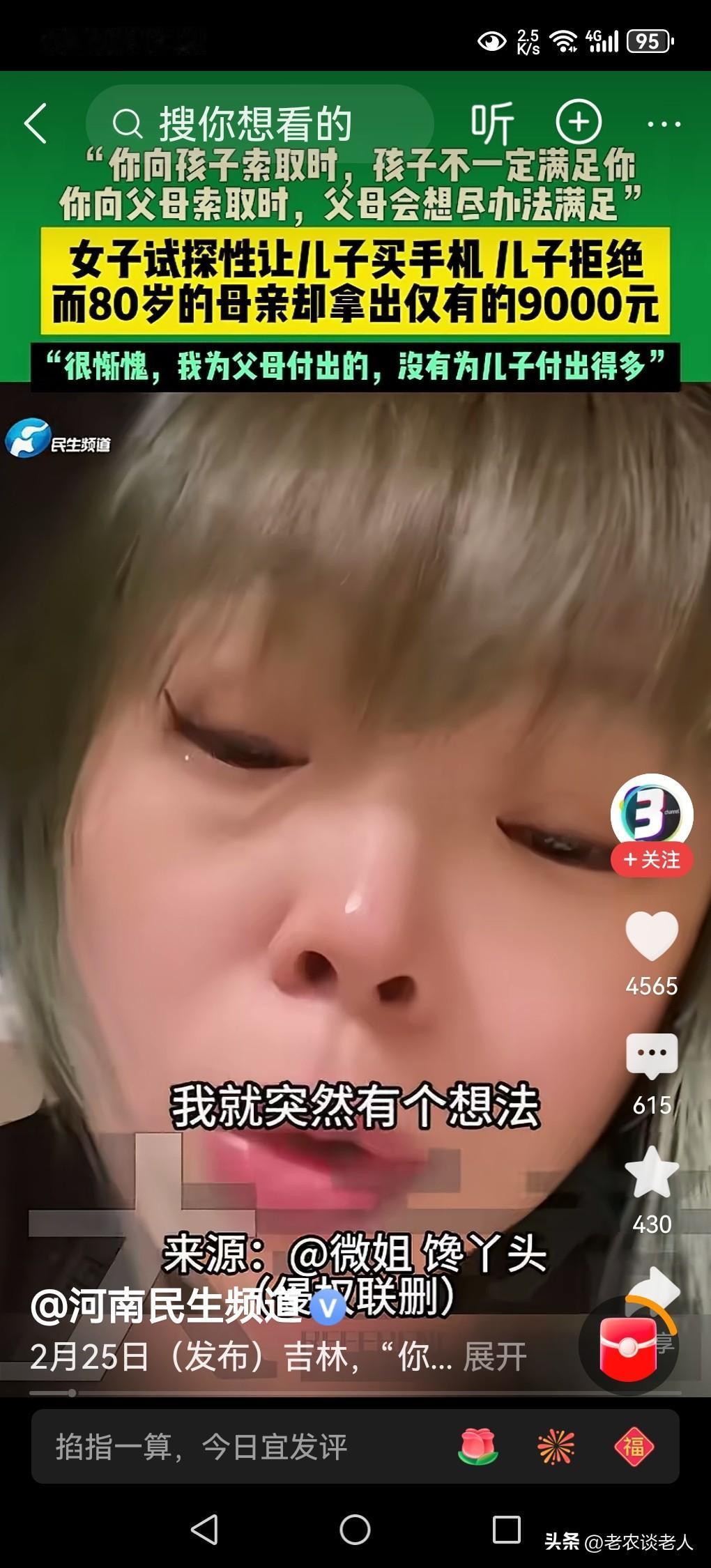 女子试探让儿子帮买手机被拒! 在我们的现实社会里,在实际的日常生活中,父母向孩子索取的时候,孩子不一定会完完全全的满足父母的需要,而孩子向父母索取的时候,父母却会想尽办法不遗余力的满足子女的需要,这就是社会现实,这就是人性。 据媒体2月27日报道,有一位女子,试探性让儿子买手机,却被儿子无情的拒绝了!而80岁的老母亲却拿出仅有的9000元钱给孩子的时候,孩子是否感到很惭愧?子女为父母付出的,却远远没有父母为子女付出的多。 从道理上来说,孩子对父母是否有孝心,是否尊重老人,是否满足老人一切要求,都取决于父母,取决于父母对子女的教育问题。 孩子从幼小的时候起,得到了父母和家庭里优良的正常的传统文化道德教育,那么孩子对老人就有孝心,对父母就会尊敬,就会尊重,就会有良好的赡养,否则子女就不一定会满足父母的需求,对父母就不一定有良好的孝敬。 当子女成长大了,成家立户以后,对父母的孝心,已经形成了定格,很难得到改变。 有孝心的子女,父母不需要试探,子女就会懂得孝敬自己,没有孝心的子女,父母无论怎样试探,都是无济于事的,反而伤了自己的心。 父母对子女有良好的传统道德教育,那么,爱是彼此的,相互的,对等的,无条件的。 父母对子女没有良好的传统道德教育,或者欠妥,那么,爱是向下倾斜的,父母对子女的爱永运多于子女对父母的爱!不需要反驳,毋庸置疑,这就是人性! 以上是本人观点,如有不妥,请大家在留言区处,留下你宝贵的意见,并积极参与评论,特邀请大家关注老人养老问题。