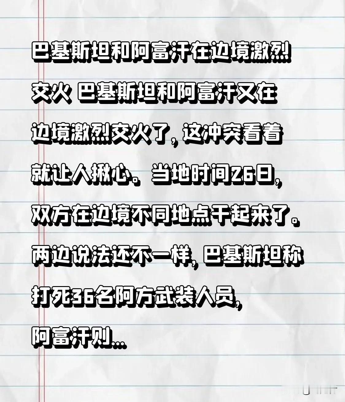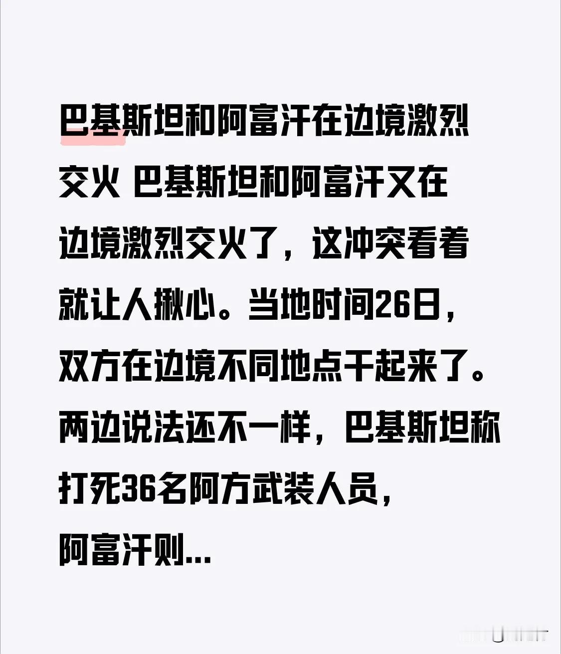 巴基斯坦和阿富汗在边境激烈交火 巴基斯坦和阿富汗再度在边境激烈交火,局势令人揪心。当地时间26日,双方在边境不同地点爆发冲突。双方说法存在差异,巴基斯坦称打死36名阿方武装人员,阿富汗则表示打死55名巴方士兵。 27日凌晨,巴方发起空袭,冲突持续升级。阿富汗政府发言人称此次行动是对巴方“挑衅”的回应,还夺取了巴方15处军事哨所。而巴基斯坦则称阿方“误判形势”“无端”炮击。 自去年10月以来,两国边境已多次交火,此前虽有停火协议,仍未能避免冲突再现。真心希望他们能早日实现和平。 巴基斯坦战乱 阿富汗军事冲突