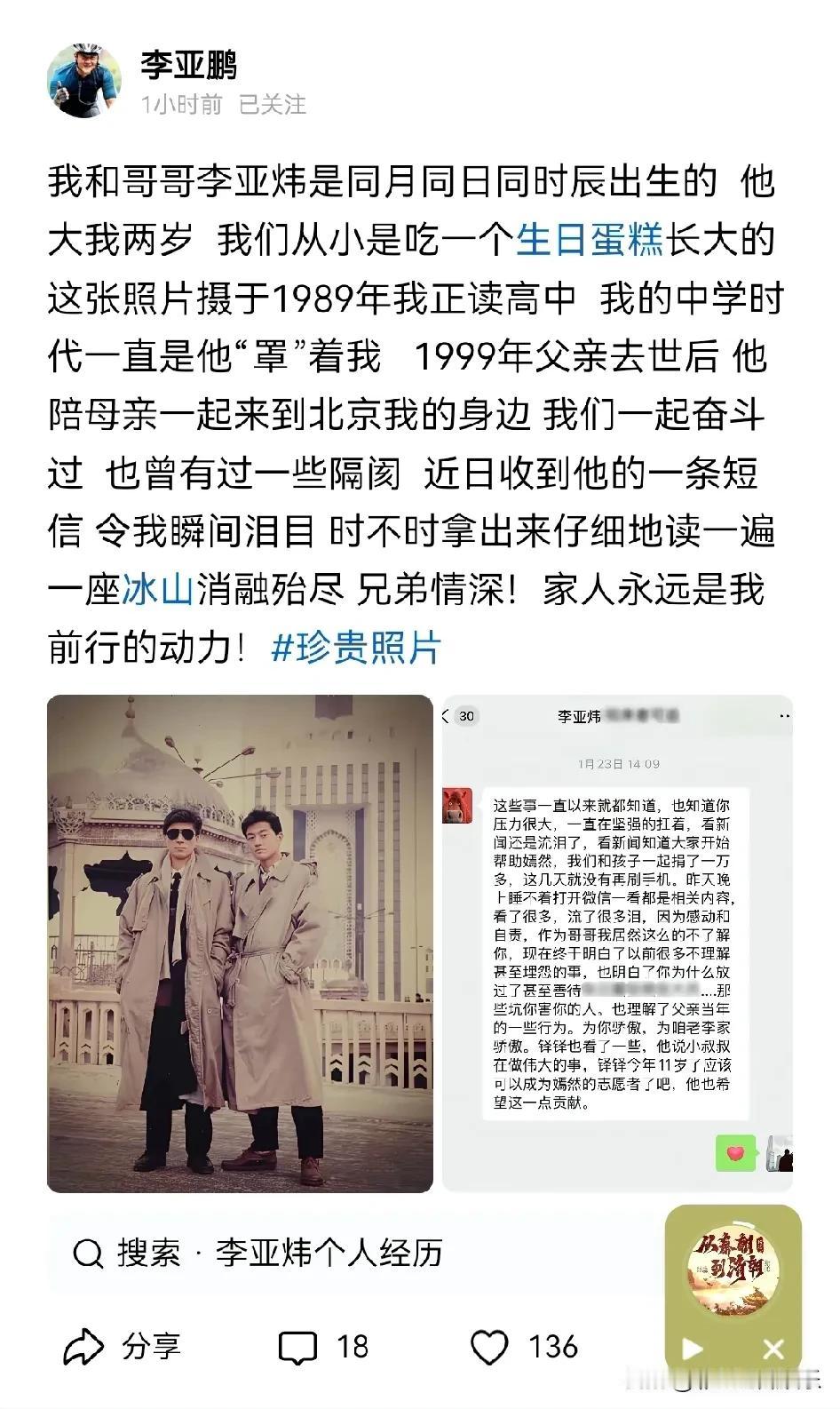 李亚鹏晒与哥哥的聊天记录,太感人了!以前和哥哥一起投资云南雪山艺术小镇血本无归成为老赖,兄弟差点反目为仇。 李亚鹏从小与哥哥感情好,他们是同日同月出生的,哥哥比他大小两岁,每年都一起过生日缘分至深。 哥哥得知李亚鹏一个人支撑嫣然天使儿童医院,感动到流泪,和李亚鹏冰释前嫌。 血浓于水,打断骨头连着筋,兄弟之间没有隔夜仇,这就是亲情的力量!