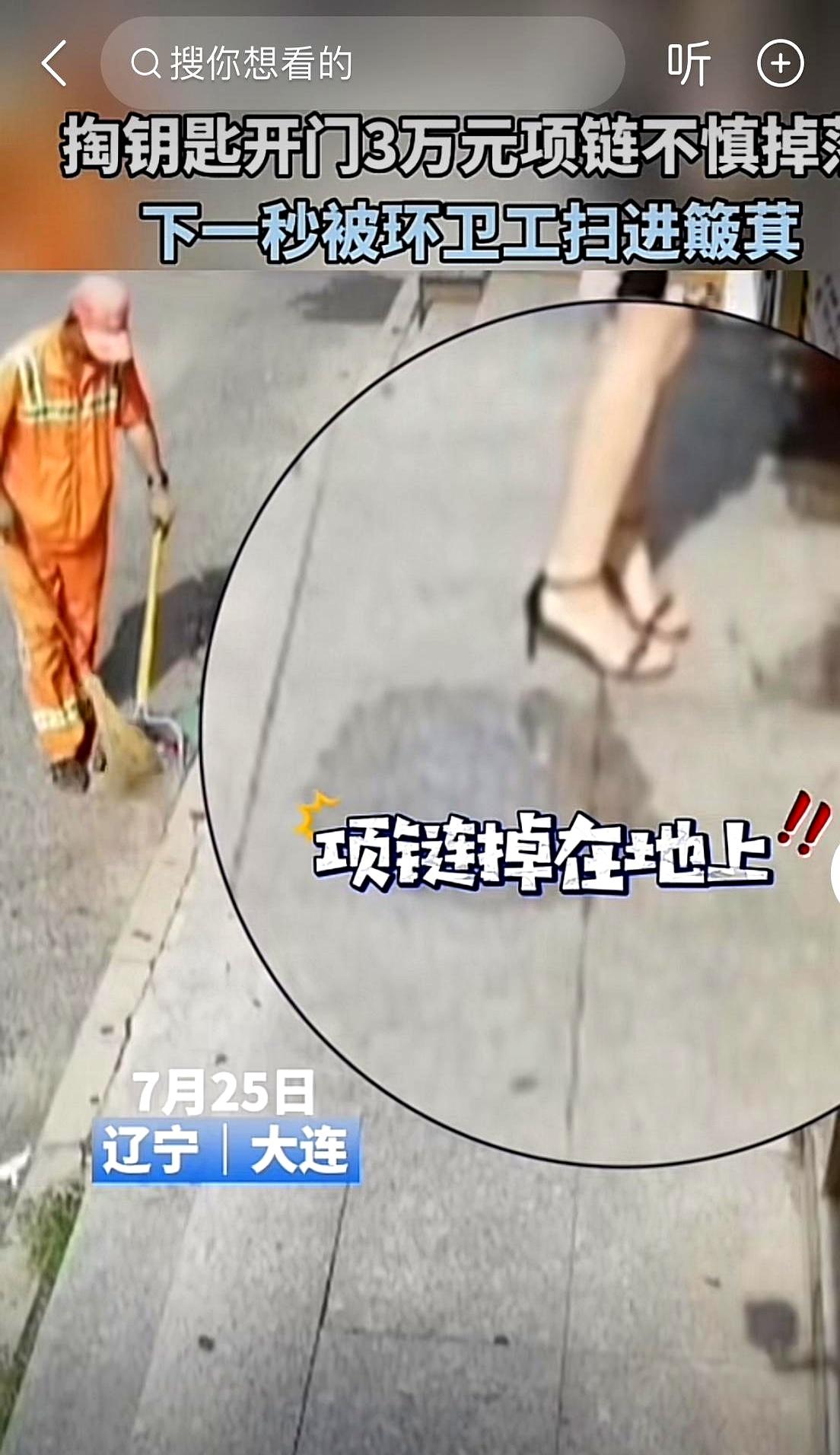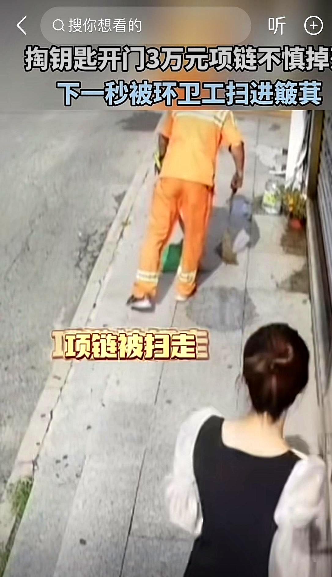 今天看到条视频,心里咯噔了一下。 一女子掏钥匙时,不慎将价值三万多的项链掉在地上;一名环卫工人把它顺手扫进簸箕。 幸好女主及时察觉,不然三万块就没了。 评论里有人写道,穷容易生出心机,富了才会长出良心。 不能以偏概全,但这事儿像极了反面教材:把“捡到就是我的”当成理所当然,与明目张胆的偷窃差别并不大。 问问社会,不只是舆论的谴责,还得有能让人抬头做人、安心工作的制度和尊严...