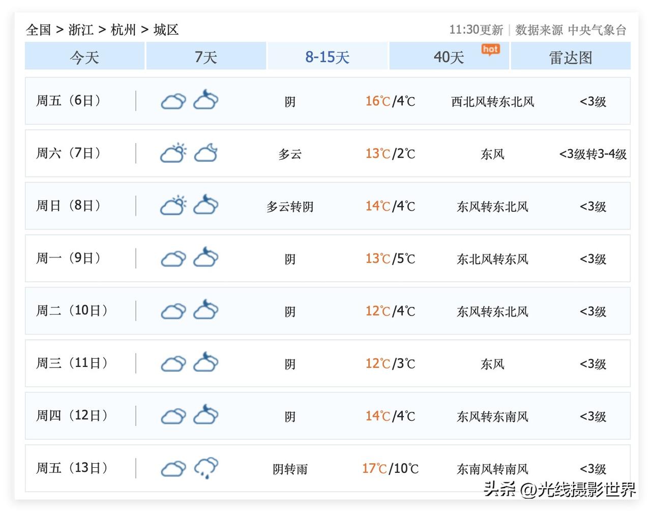 老天爷给杭州市送上大惊喜啦!虽然3月1日和4日的杭州都要下雨……但是,3月3日,元宵节,杭州多云,元宵节的杭州不下雨,简直是惊天大喜讯啊!太棒啦! 只是,虽然元宵节的杭州不下雨,但是,3月3日,杭州气温只有10-7度,还是很冷,还是要穿羽绒服和秋衣秋裤……噢耶! 3月1日到12日,杭州气温持续低迷……阴雨天比较多…… 因此,想要去杭州赏花的小伙伴们,可以在3月13日,哦,不可以在3月13日去杭州,因为3月13日是星期五,马上就是周末……退休老人们,建议3月15日或者16日动身去杭州比较好啊! 3月11日,杭州阴天,气温12-3度。 ……
