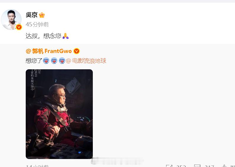 吴京悼念吴孟达去世五周年吴京悼念吴孟达 吴京转发郭帆微博,悼念吴孟达:“达叔,想念您🙏”