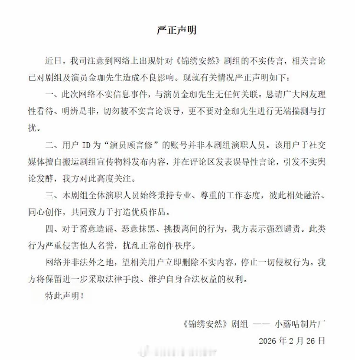 刘晓庆短剧剧组声明点赞是工伤男演员并非刘晓庆剧组演职人员 刘晓庆短剧剧组发布声明,称男主金珈与网传不实信息没有关联,点赞“合作是工伤”的男演员并非剧组演职人员,只是擅自搬运物料、发布误导性言论。剧组对造谣行为强烈谴责。