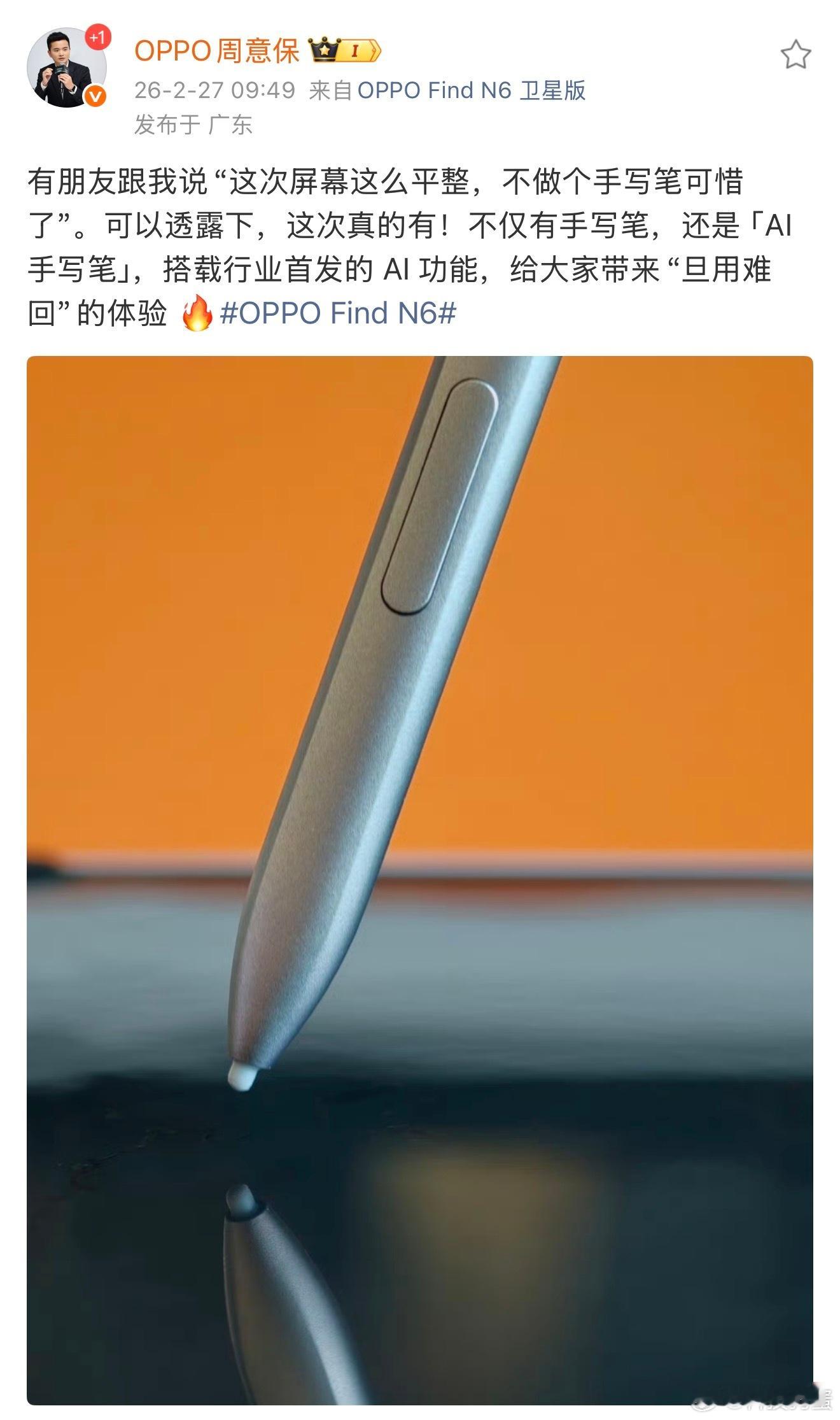 丢,OPPO Find N6还真有AI手写笔啊。方向没错,折叠屏就应该往生产力上靠。但……咋收纳呢,或许外屏侧边?那里没有按键,刚好磁吸可以放