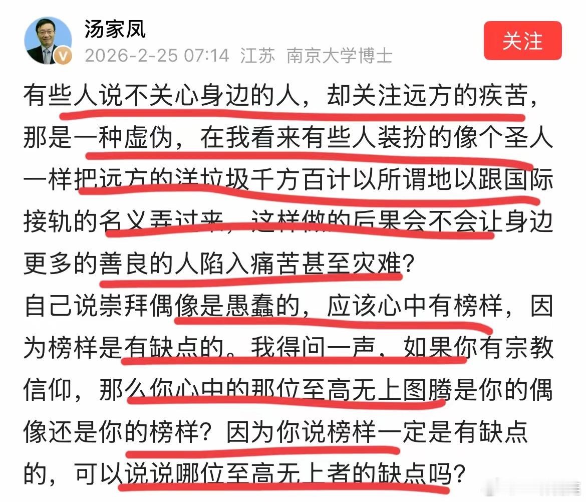 马年春节之后,南京大学博士汤家凤复工第一天,就忍不住发文怒怼罗翔教授!!春节假期,汤博士估计是碍于节日气氛,忍了好多天了,上班马上发文怒斥罗教授太虚伪,太双标了!尤其是在春节期间,教授还居然录制了一个视频疑似回应了萝莉岛事件~他的核心意思是,不要制造偶像,他也不需要你们把他当成偶像,制造偶像,把人当成偶像都是愚蠢的行为,人类只能有榜样,不能有偶像,偶像这一切终究会腐朽和幻灭!!汤博士怒斥,把洋垃圾奉为圭臬,这是偶像还是榜样,你的榜样,萝莉岛,精神导师,你不敢评价几句?太刚了,汤博士!罗教授还是少说两句吧,让时间证明一切,让时间冲淡一切!对此,你有何看法呢?罗教授会最终站出来点名评萝莉岛事件么,我们拭目以待吧!