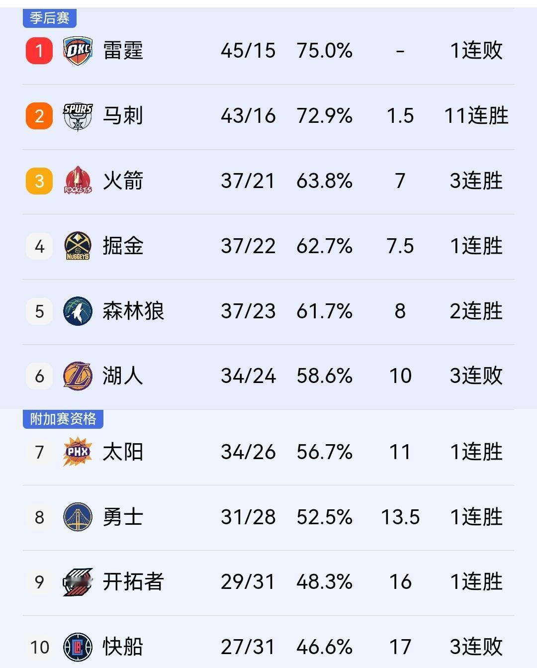 湖人三连败,胜场与第7名太阳持平,附加赛板上钉钉! 今天上午10点开始的一场NBA常规赛,排名第7的太阳主场迎战第六位的湖人。虽然第6和第7只差一个位置,但非常重要,关系到需不需要打附加赛。 本场比赛,东契奇空砍41+8+8,湖人以110-113惜败给太阳,老詹状态不是太好,得到15分6篮板5助攻。太阳方面阿伦表现出色,得到全队最高的28分,吉莱斯皮也有21分入账。 湖人丢掉关键比赛,虽然依然排在第6位,但与身后太阳的胜场完全一样。而排在第五位的森林狼今天赢球,顺势拉开与湖人的差距,目前两队差了两个胜场。 太阳未来10场比赛:国王、公牛、鹈鹕、黄蜂、雄鹿、步行者、猛龙、凯尔特人、森林狼、马刺! 湖人未来10场:勇士、国王、鹈鹕、掘金、步行者、尼克斯、森林狼、公牛、掘金、火箭、火箭! 赛程来看,太阳明显好于湖人,目前状态和气势,湖人大概率要先打附加赛了!