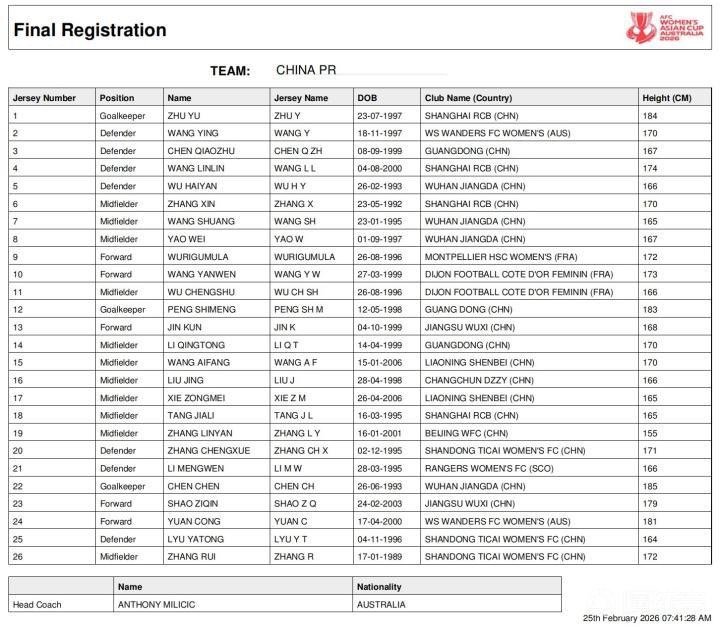 女足亚洲杯亚足联公布2026年女足亚洲杯中国队名单,辽宁女足王爱芳身披15号球衣,谢宗梅身披17号球衣。