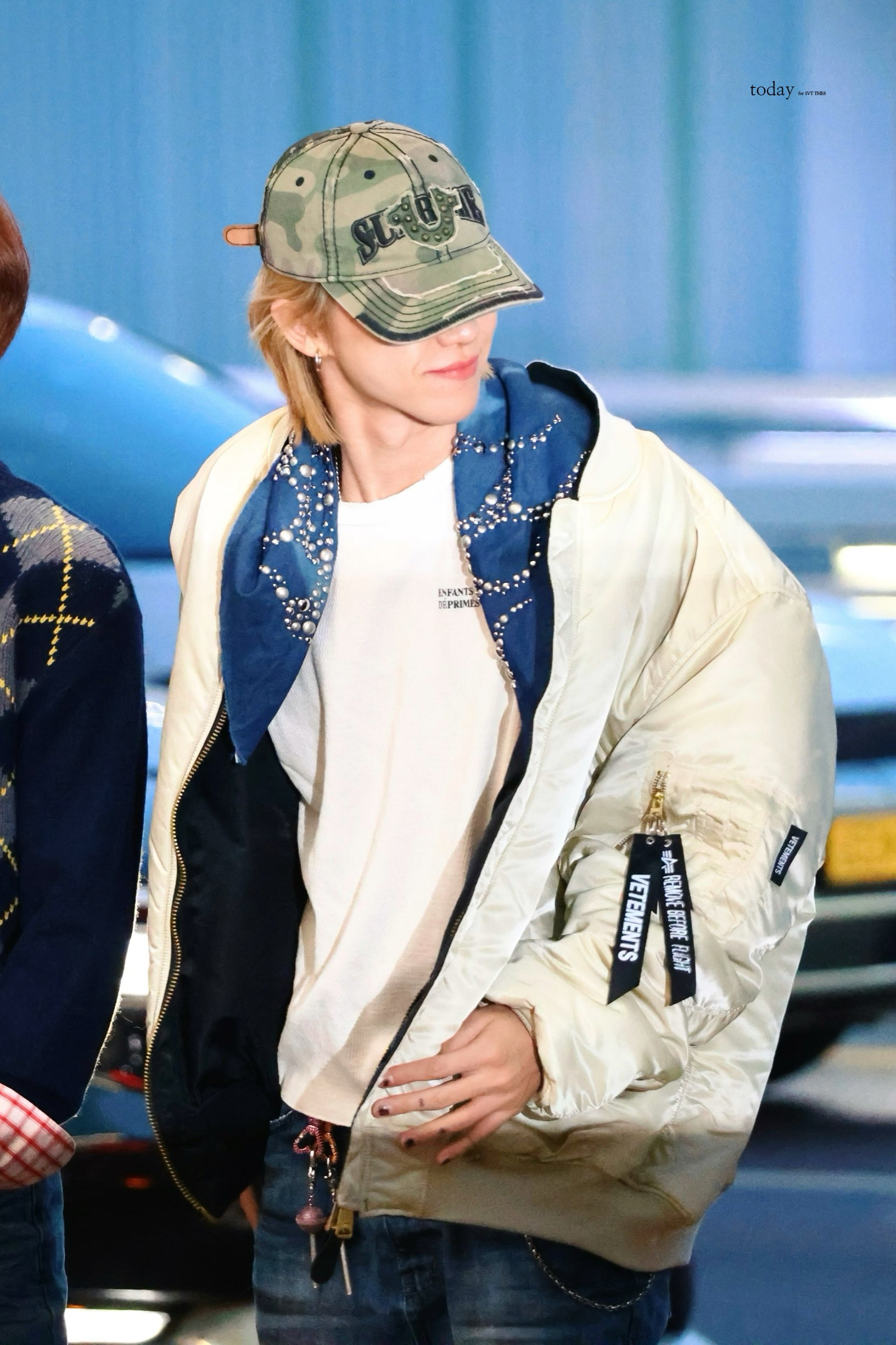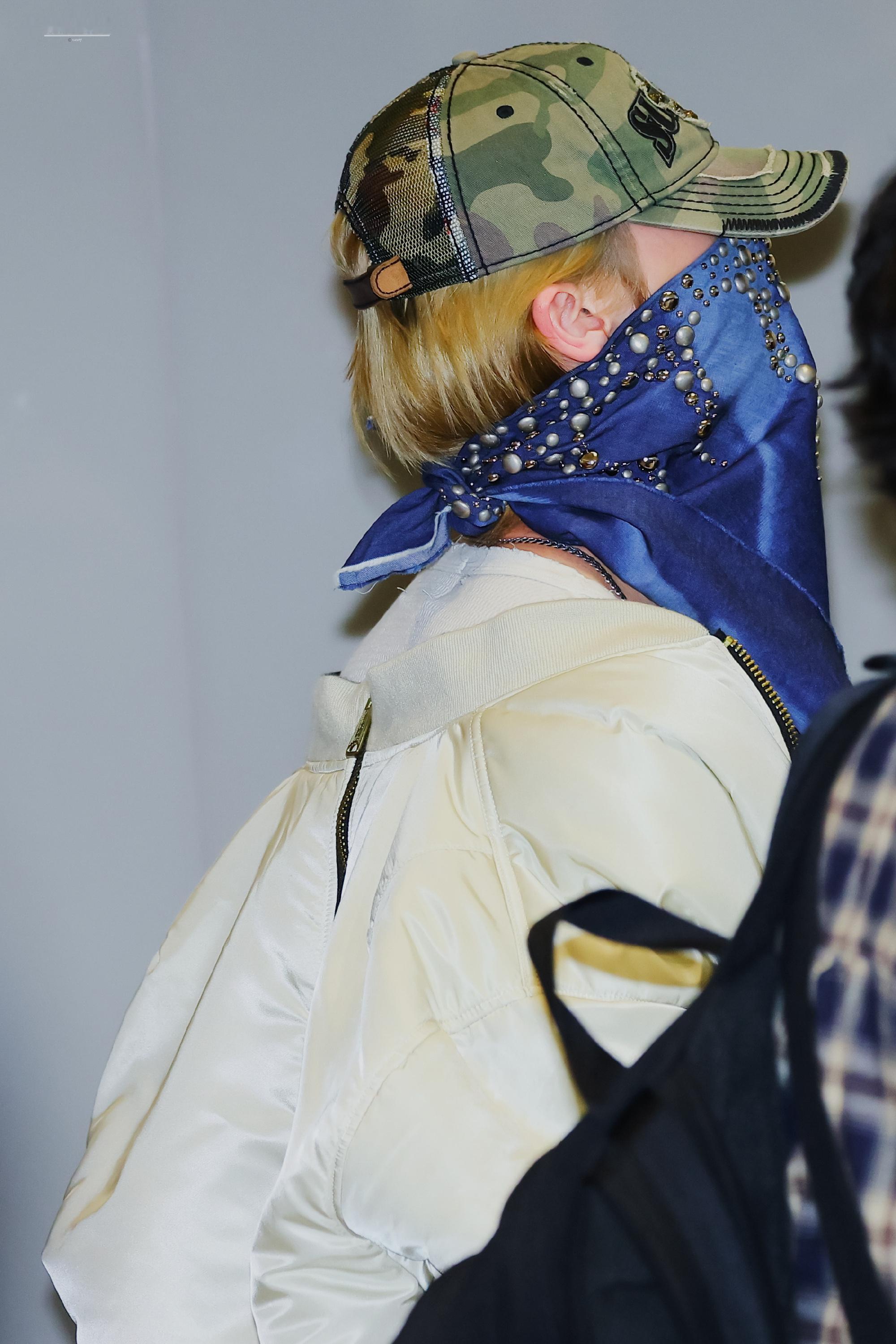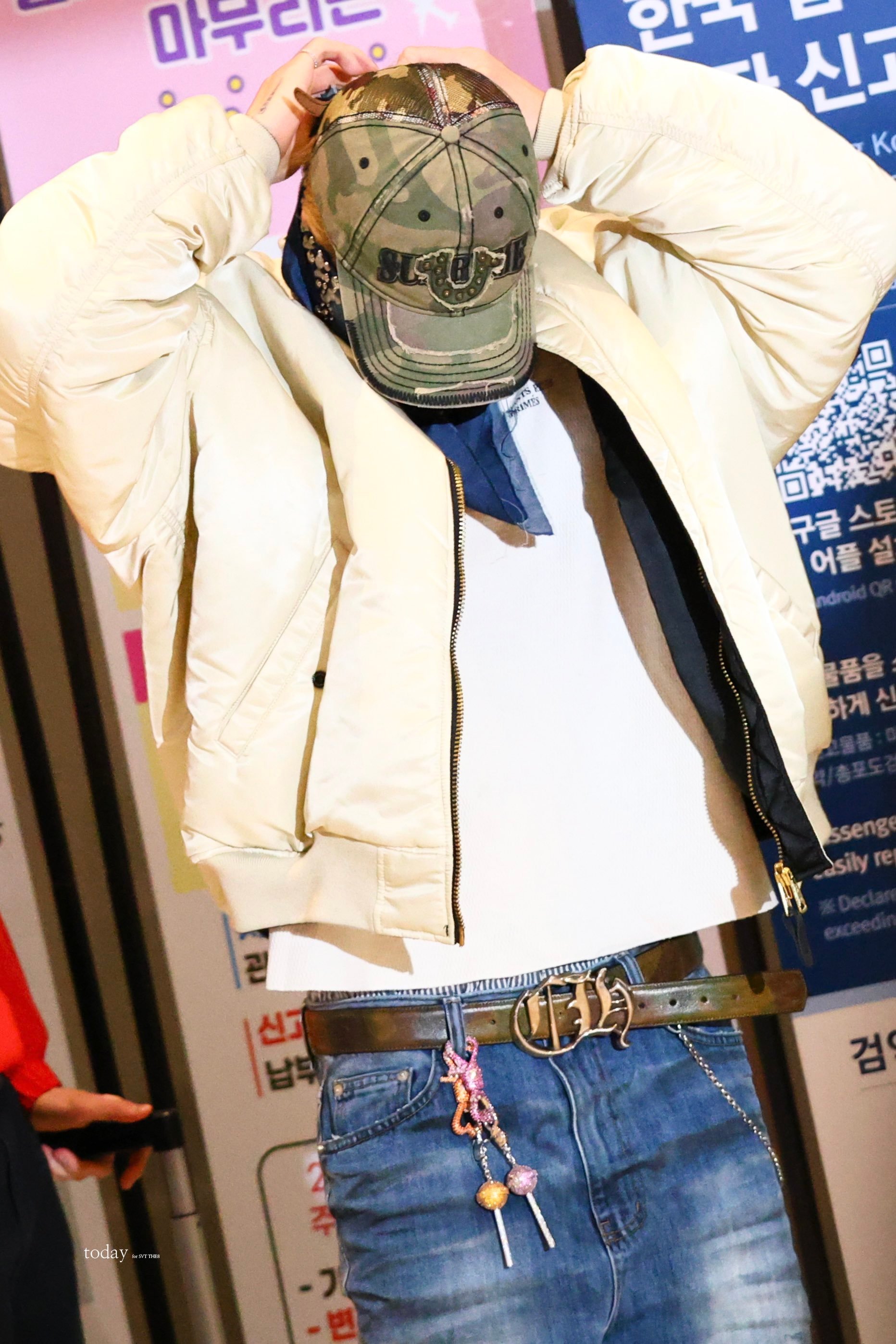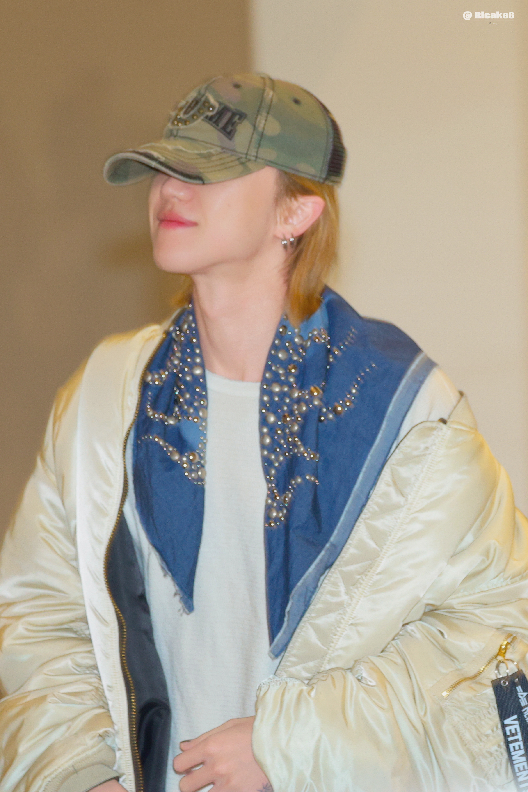 身穿Enfants Riches Déprimés T恤搭配VETEMENTS 飞行员夹克与Supreme X TRUE RELIGION 联名棒球帽,克罗心腰带加身,一条牛仔蓝铆钉丝巾点缀,潮成这样,实力穿搭模范营业😎✨