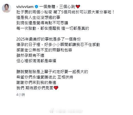 何依婷、蔡嘉欣、陈诗欣的模特闺蜜谭嘉仪(Vivi Tam)日前宣布怀孕,她拿着一张五格的宝宝超声波照说:“一个身体,三个心跳。肚子里的两个小秘密,藏了5个月终于可以跟大家分享啦!”她又表示这是人生从未想过的事:“每一次胎动,都在提醒我,这一切都是真的。”
