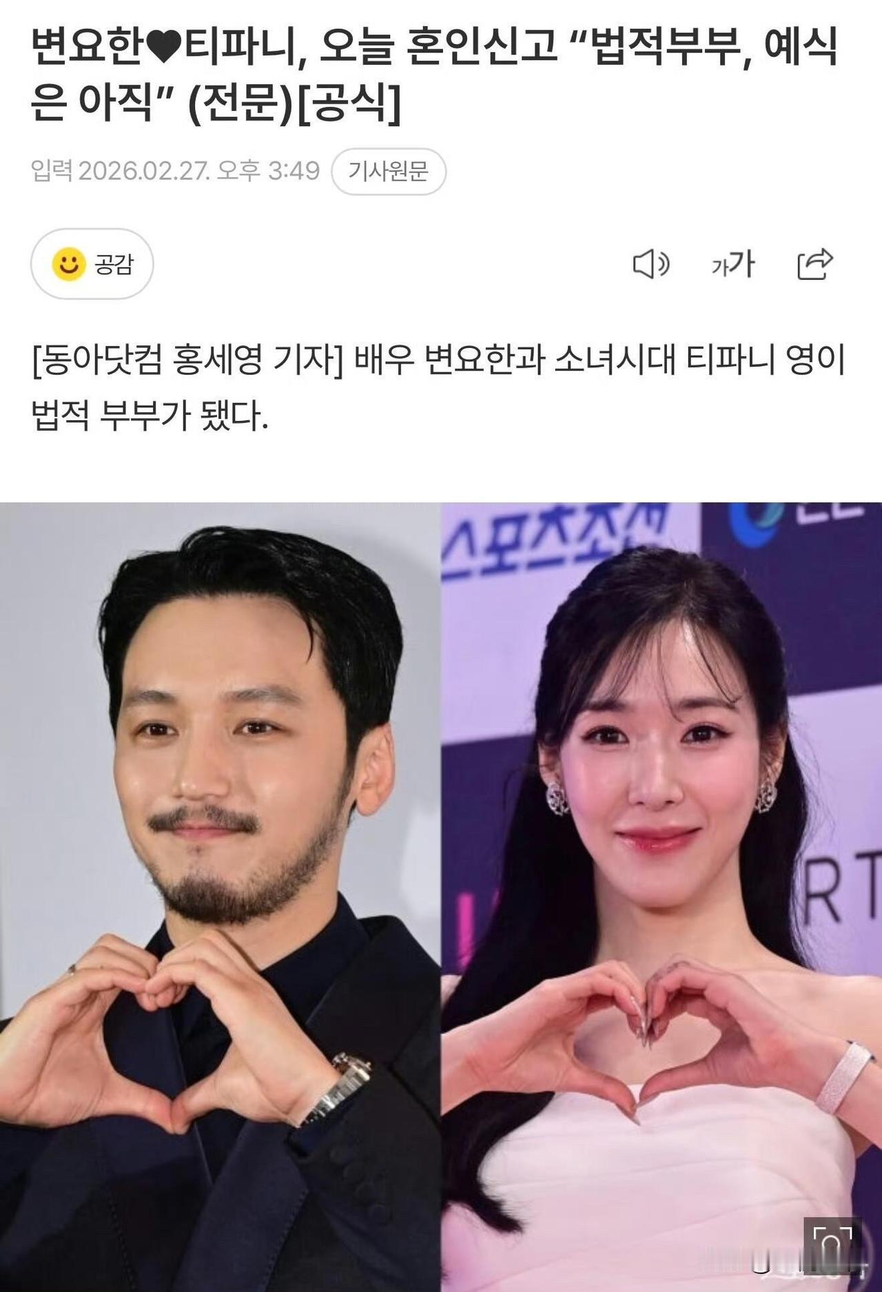 谁能想到少女时代第一个结婚的会是她? Tiffany和卞耀汉,今天正式完成婚姻登记了! 两人因去年5月播出的Disney+剧集《三食叔叔》结缘,戏里搭档默契,戏外慢慢走到一起, 从同剧演员变成相守的伴侣,真的太好磕了! 经纪公司刚官宣, 两人凭着对彼此的深爱与信任定下终身, 哪怕担心外界有杂音, 还是第一时间给粉丝报喜,这份心意太戳人。 婚礼暂未定具体细节, 打算办一场简朴的家庭礼拜, 不搞噱头不铺张,低调又真诚。 谁的青春里没追过少女时代啊, 真心祝福姐姐,往后被爱稳稳包裹,永远闪闪发光。