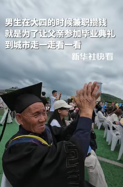 “这才是读书的意义。”2025年,贵阳一大学本科男生“骗”农村70岁的老父亲来参加他的毕业典礼,他告诉老父亲必须家长签字,才能领到毕业证。怕老父亲不舍得花钱,他提前几个月开始送外卖攒钱,就想带老父亲来贵阳转一转。 2025年,贵阳一位本科男毕业生的暖心操作,在网上悄悄火了起来,没有刻意炒作,没有华丽包装,却让无数看完的人红了眼眶,大家纷纷感叹,这才是读书最本真、最动人的意义。 很多人穷其一生追寻读书的价值,而这个普通男孩,用一个温柔的谎言和实打实的行动,给出了最接地气也最戳心的答案。 这个男孩来自地道的农村家庭,家里的依靠是已经 70 岁的老父亲,老人这辈子都扎根在田间地头,日出而作日落而息,把一辈子的心血都砸在了供儿子读书这件事上。 在老人的认知里,读书是孩子走出大山、摆脱面朝黄土背朝天生活的唯一出路,所以哪怕自己省吃俭用、拼命劳作,也从没让儿子在学业上受过一点委屈。 老人这辈子去过最远的地方只是离家几十里的小县城,日常出行全靠村里的三轮车,火车、高铁、城市的高楼大厦,对他来说都只是儿子电话里描述的模糊画面,一辈子都没机会亲眼看一看。 转眼到了毕业季,男孩看着身边同学的父母纷纷赶来参加毕业典礼,分享孩子的成长喜悦,心里也悄悄埋下了一个心愿:他一定要让操劳大半辈子的老父亲,亲自来贵阳看看自己读书的校园,亲眼见证自己拿到毕业证的重要时刻。 可他太了解自己的父亲了,老人一辈子节俭到了骨子里,不是小气,是舍不得花一分血汗钱,更不想给刚毕业的儿子添任何经济负担。 如果直接邀请父亲来贵阳,老人肯定会找各种理由推脱,说路费太贵、住宿费钱、家里农活走不开,说到底就是不想让儿子多花一分钱。 思来想去,男孩心里冒出了一个充满孝心的善意谎言,他特意拨通家里的电话,用特别认真严肃的语气告诉老父亲,学校有硬性规定,本科毕业生领取毕业证,必须由直系家长亲自到场签字确认,少了这个流程就没法顺利领证。 这个理由精准戳中了老人最在意的事,在父亲心里,儿子的毕业证是十几年寒窗苦读的成果,是全家最大的盼头,听完这话,老人半点犹豫都没有,立马收拾行李,准备动身前往贵阳。 为了让父亲这趟行程过得舒心自在,不用为花钱揪心,男孩早在毕业前三个多月就开始默默筹备。 他放弃了所有课余休闲时间,告别了和同学聚会玩乐的机会,找了一份送外卖的兼职,把所有空闲时间都扑在了跑单上。 对男孩来说,每一笔配送费都是沉甸甸的希望,跑单再累、再晒、再淋雨,只要一想到父亲能舒舒服服来贵阳,所有疲惫都瞬间烟消云散。 他从没想过要跟父亲诉苦,只想着用自己的汗水,给父亲换一次不留遗憾的毕业之旅。 父亲出发那天,天不亮就起了床,翻出了自己压箱底的衣服,为了能在毕业典礼上打扮的体面一点,男孩担心父亲受不住多次换乘,于是干脆租了一辆汽车,开车送父亲到自己的学校。 抵达贵阳后,他带着父亲住进提前订好的干净整洁的旅馆,刻意隐瞒真实房价,只说是学校合作的优惠房源。 带着父亲漫步校园,指着教学楼、图书馆、食堂和操场,细细讲述自己四年的学习生活。 老人走在校园里,脚步放得很慢,眼睛不停打量着周围的一切,看着朝气蓬勃的学生,看着整洁优美的校园,嘴角一直扬着抑制不住的笑容,嘴里不停念叨着 “我儿真的出息了”。 毕业典礼当天,整个校园都洋溢着喜悦的氛围,父亲穿着一身洗得干干净净的旧衣服,端端正正坐在家长席上,目光始终紧紧追随着台上的儿子,眼神里满是藏不住的骄傲与欣慰。 在男孩心里,读书十几年,拿到的从来不止是一张毕业证,更是有能力回报父母的底气,是有机会带操劳一生的父亲看世界的资本,是用自己的成长,接住父亲一辈子的付出。 很多人都在追问,读书的意义到底是什么?是找一份高薪工作,是过上优渥的生活,还是实现远大的梦想? 而这个贵阳男孩用最朴素的行动给出了答案:读书的意义,从来不止是知识的积累、学历的加持,更是让我们在长大成人后,有能力守护最爱我们的人,有底气让为我们倾尽所有的父母,感受到片刻的欣慰与幸福,有资格成为曾经撑起整个家的父母的依靠。 我们努力读书、拼命成长,最终的意义从来不是活成多么耀眼的模样,而是让父母的付出有回响,让他们的晚年有依靠,这便是读书最踏实、最温暖的终极意义。 对于这件事,您有什么想说的吗?欢迎评论区留言讨论。 信源:新华社2025-06-27——《读书的意义在此刻具象化了!男生为让70岁父亲参加毕业典礼,撒了一个善意的谎。》