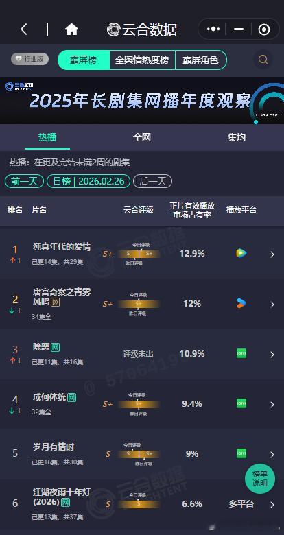 纯真年代的爱情云合S加纯真年代的爱情12.9%登顶云合纯真年代的爱情云合S加,纯真年代的爱情12.9%登顶云合,咱就说期待住接下来的故事发展啦~