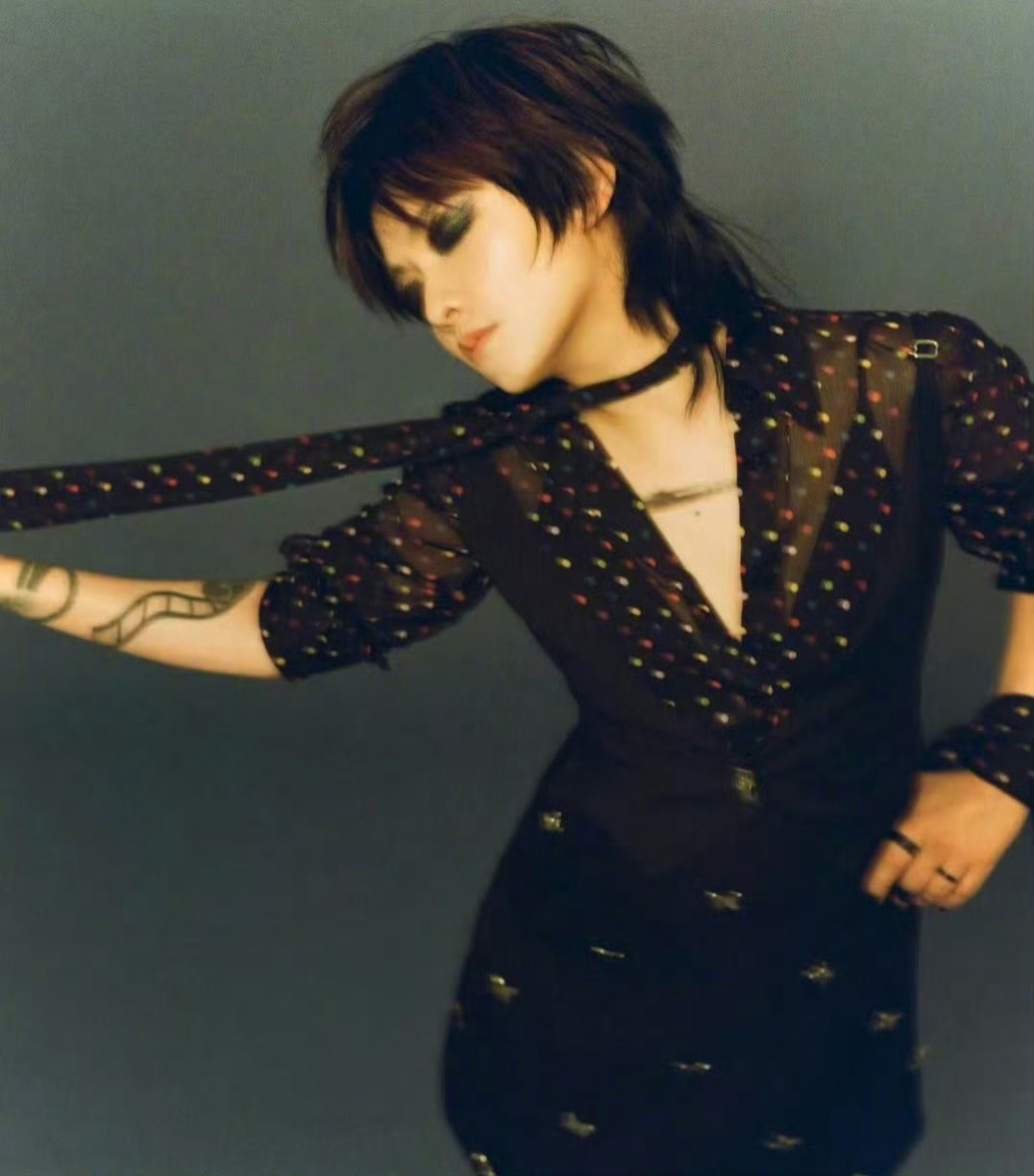 范晓萱风格大变范晓萱黑唇绿发 范晓萱这是把整个暗黑宇宙穿在身上了吧,绿发如妖冶藤蔓,黑唇似致命毒药,泼墨妆面写满不羁密码。从“小魔女”到“暗黑新娘”,她亲手撕碎所有标签,在废墟上开出属于自己的黑色玫瑰