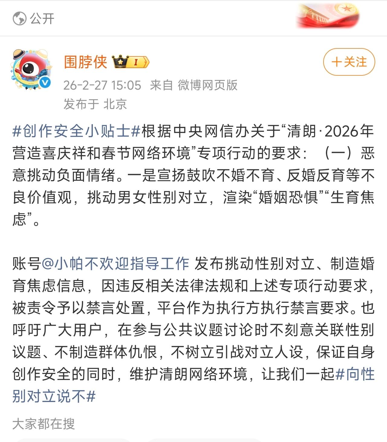 看了正式的文告: 宣扬鼓吹不婚不育、反婚反育等不良价值观,挑动男女性别对立,渲染“婚姻恐惧”“生育焦虑”。 账号@小帕不欢迎指导工作 发布挑动性别对立、制造婚育焦虑信息! 有些女脱口秀演员,长期在性别对立、不婚不育、反婚反育方面,都是主力军,大肆地打拳,疯狂地挑动,野蛮地撕裂社会!