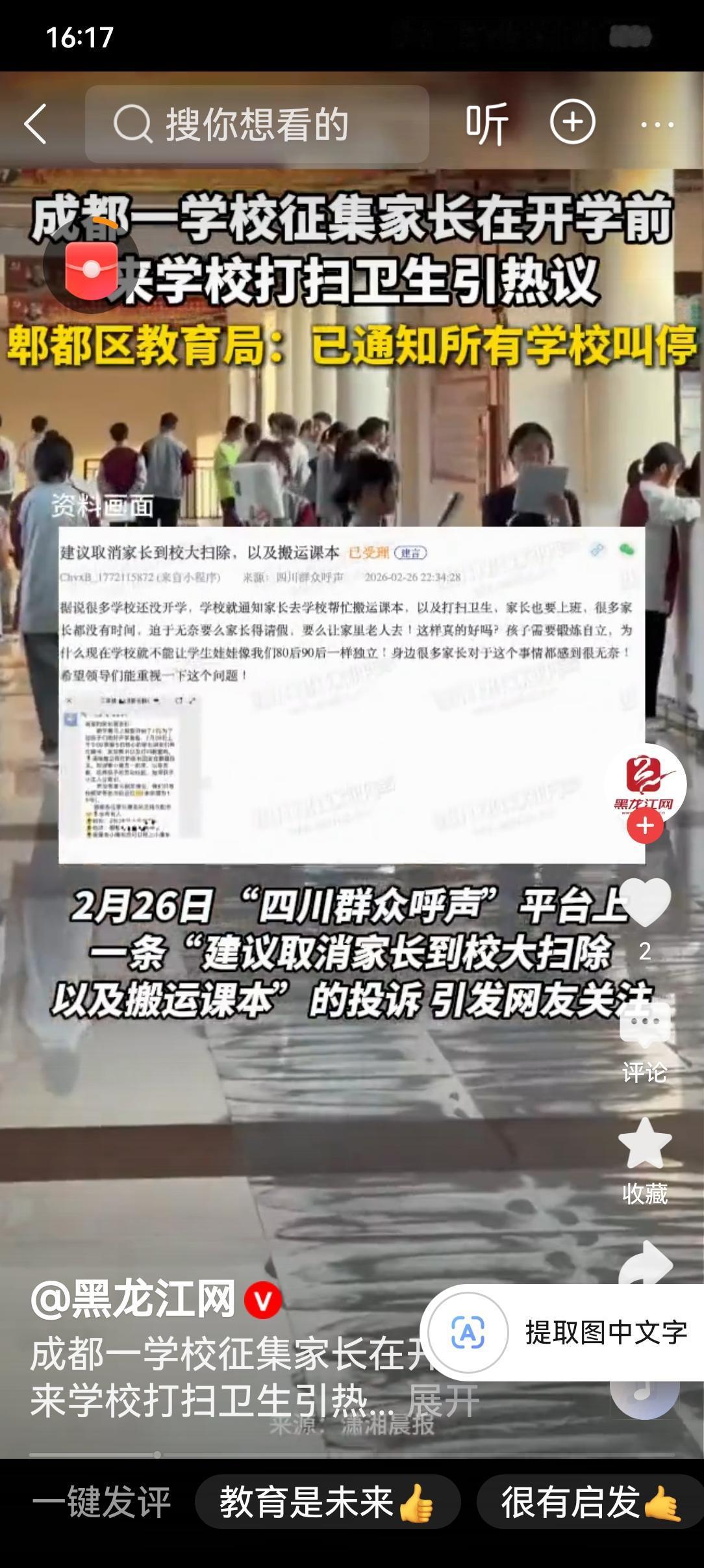 “教育的本质,是让孩子在劳动中独立,而不是让家长在忙碌中崩溃。学校不打扫卫生是‘懒’,家长代劳是‘宠’,孩子不干活是‘早就该叫停这种‘甩锅式’管理了,把成长的机会还给孩子,把管理的责任留给学校!”