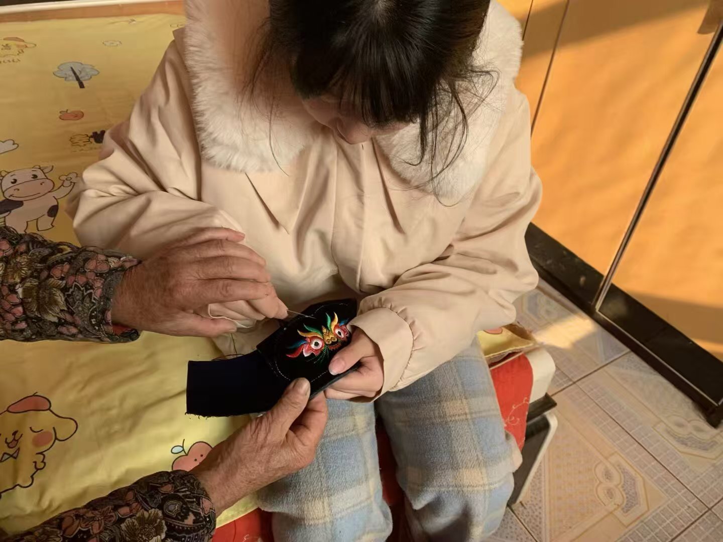 秦岭笑谈 【针脚承非遗 绣鞋传匠心】曲阜师范大学大学生社会实践寒假社会实践三下乡 为探寻民间传统手工艺的生存现状与传承路径,助力非物质文化遗产活态传承,近日,曲阜师范大学思乐泮水社会实践队员走进乡村,寻访虎头鞋制作技艺传承人,沉浸式体验虎头鞋的制作流程,用实际行动为这项古老民间技艺的传播与推广注入青春力量。虎头鞋是中国北方民间流传已久的传统手工艺品,以棉布为原料,通过纳底、绣面、缝合成型等多道工序制作而成,鞋头绣制威风凛凛的虎头造型,兼具实用价值与文化寓意。在民间习俗中,虎头鞋被赋予驱邪避灾、保佑孩童健康成长的美好愿景,其制作技艺融合了刺绣、布艺、纳缝等多种传统工艺,是劳动人民智慧的结晶,也是地域民俗文化的重要载体。此次实践聚焦乡村虎头鞋制作技艺,重点围绕技艺传承现状、制作工艺精髓以及传承推广困境与对策展开实践调研。在乡村的一处民居内,实践队员见到了深耕虎头鞋制作技艺六十余年的传承人。实践队员重点参与了虎头鞋刺绣环节的体验学习。传承人向实践队员细致讲解了虎头造型的刺绣技巧,从虎眼、虎鼻的配色方案,到虎须、虎纹的针法运用,都倾囊相授。在传承人指导下,实践队员拿起针线,尝试在鞋头面料上勾勒虎眼轮廓。看似简单的刺绣动作,操作起来却极具难度,针线的走向、力度的把控都直接影响最终效果。实践队员们反复练习,在一针一线的穿梭中,真切体会到传统手工艺的严谨与精妙。在观摩与体验过程中,实践队员留意到传承人制作的虎头鞋细节满满——以藏青色棉布为基底,黑色绒布勾勒出虎头轮廓,明黄、翠绿、玫红的丝线绣制出虎眼、虎鼻与虎额上的“王”字,色彩对比鲜明,造型生动传神。鞋帮处的针脚细密均匀,纳制的鞋底厚实耐磨,既保证了孩童穿着的舒适度,又彰显了精湛的手工技艺。传承人介绍,虎头鞋的制作讲究“形神兼备”,虎头的造型既要威风,又要透着憨态,刺绣的针法需根据图案灵活调整,纳底的针脚要疏密有致,这样才能让虎头鞋既美观又耐用。此次社会实践,实践队员们以实际行动助力虎头鞋制作技艺的活态传承,不仅完成了传统技艺的数字化记录,更推动了传统技艺与青少年群体的深度连接。通过一系列实践举措,让更多人认识、了解了虎头鞋制作技艺,为这项古老的民间技艺注入了新的生机与活力。传统手工艺是中华优秀传统文化的重要组成部分,虎头鞋制作技艺的传承之路,既是民间手艺人的坚守之路,也是新时代青年的担当之路。此次实践形成的成果,为虎头鞋制作技艺的长效传承提供了实践参考,也为其他民间传统手工艺的传承推广探索了可行路径。未来,实践队员们将持续关注虎头鞋制作技艺的发展动态,持续助力传统民间手工艺的传承与创新,让老手艺在新时代的浪潮中焕发新生,让中华优秀传统文化在传承中熠熠生辉。