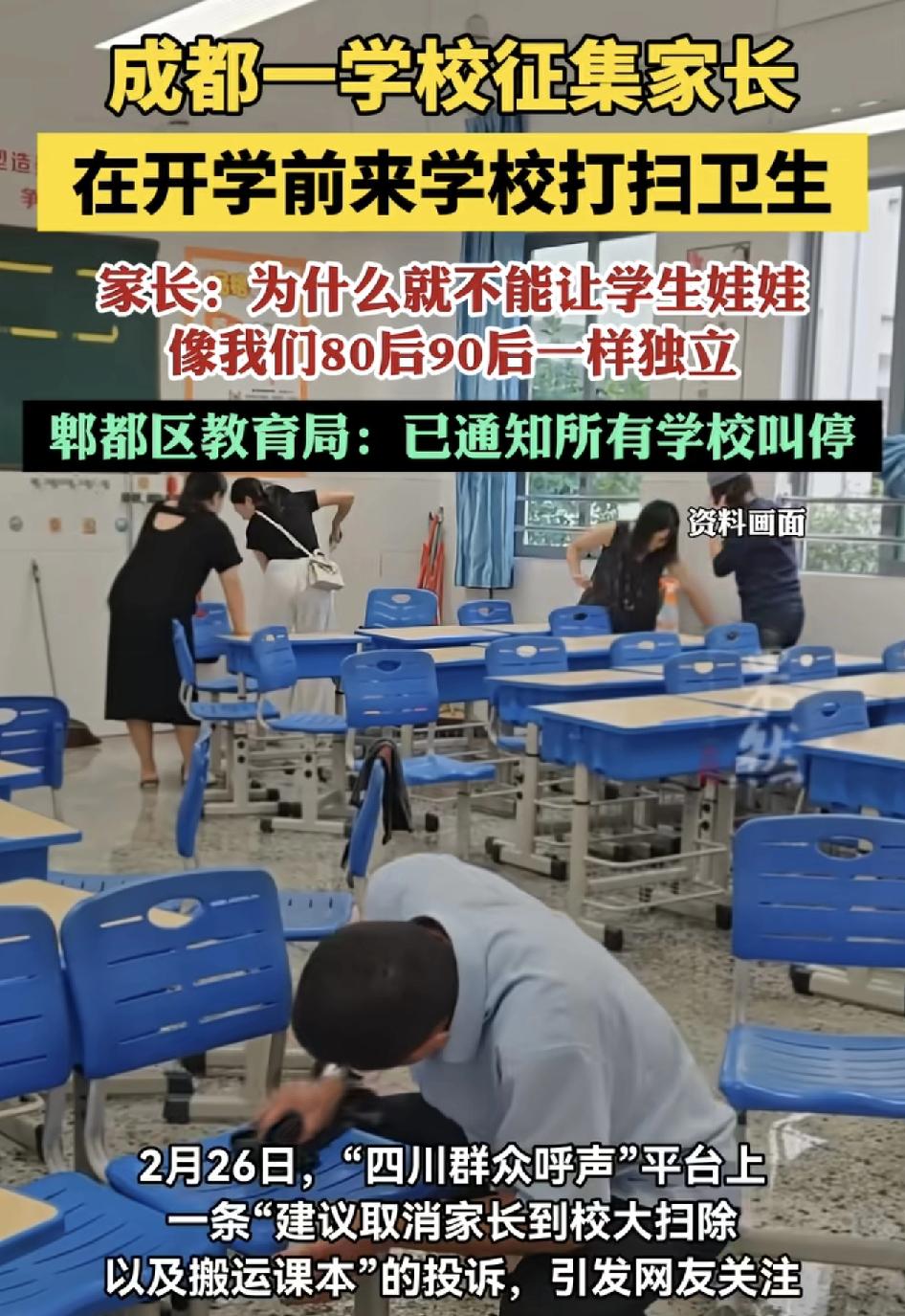四川一学校开学前征集所有的家长到学校来打扫教室卫生,搬运课本。不少家长已经向有关平台投诉,觉得这些功夫应该由学生娃娃来独立完成,因为现在家长大部分是80 90后,他们小时候。对于这些,我都是自己来完成的,而且家长都要上班,要不就是叫家里的老人去。不过也有很多家长是自愿过去的,怕孩子会弄伤弄不好,还拖延时间,干脆自己去帮忙,更有的学校,家长凑钱来请阿姨来打扫卫生。不知道是时代变了,还是我们的人变了。