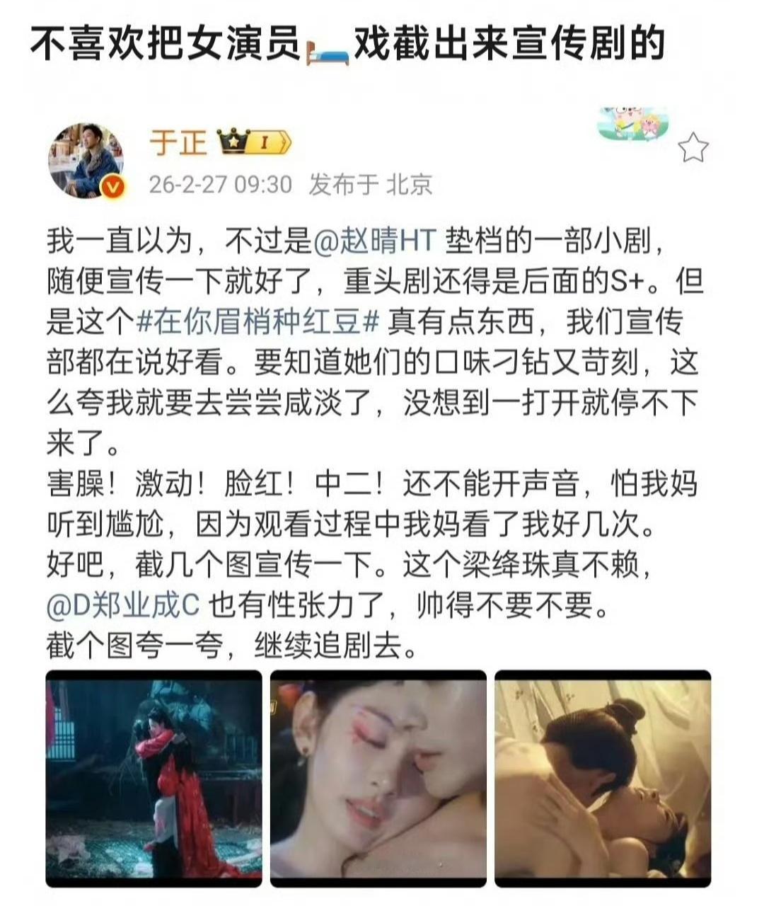 于正亲手把自己新剧里女演员的床戏截图发出来宣传,然后被网友吐槽了。为了推《在你眉梢种红豆》,他直接放了好几张剧里的亲密戏截图。