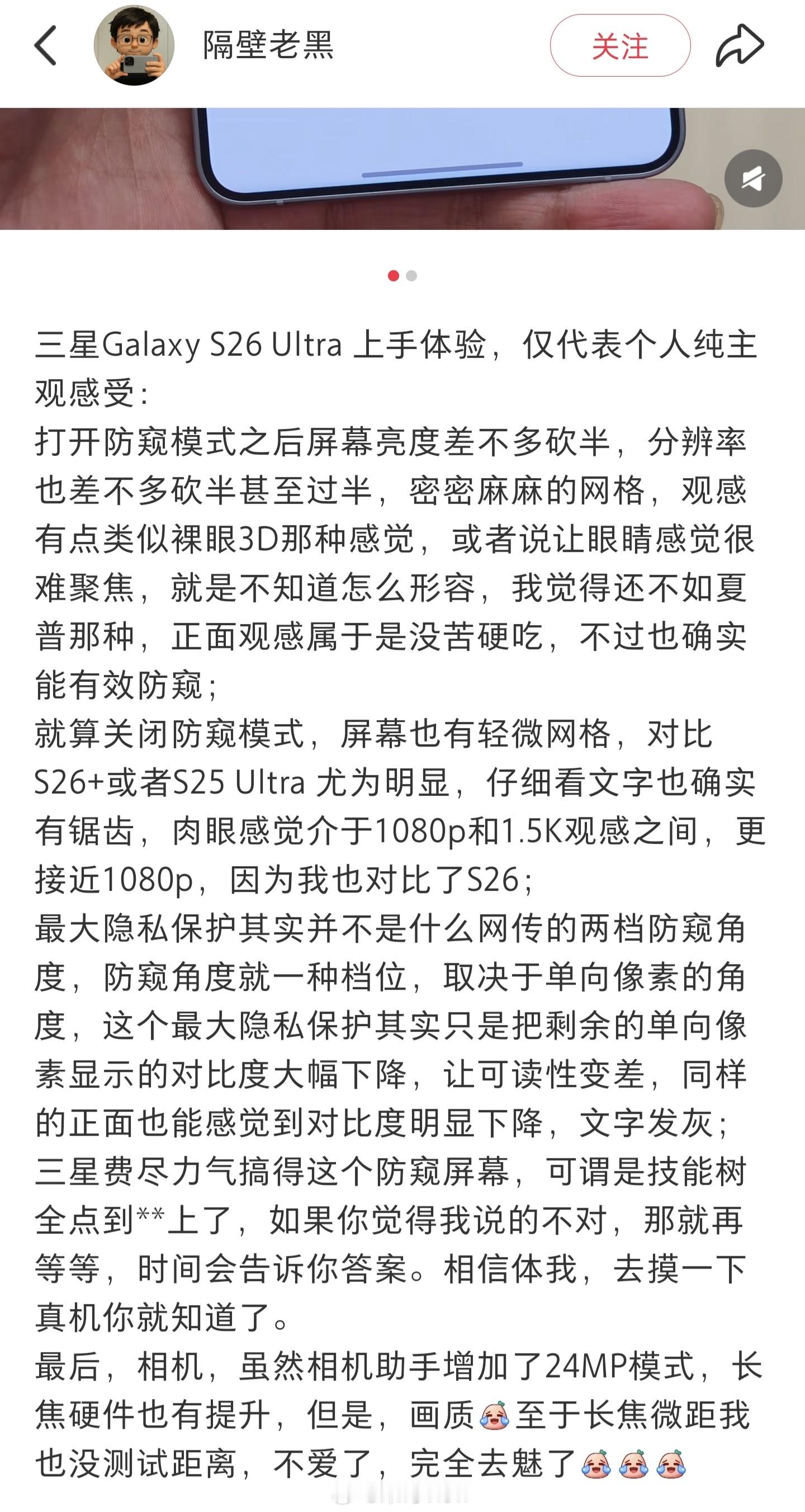 三星这次的硬件级防窥屏,从技术概念上确实是超前,但发布后在网上看实际体验下来,感觉更像是一次为了创新而妥协的技术试水。开启防窥模式后,屏幕素质有很大的衰减,三星的方案有点为了防窥而牺牲了旗舰屏本该有的体验。