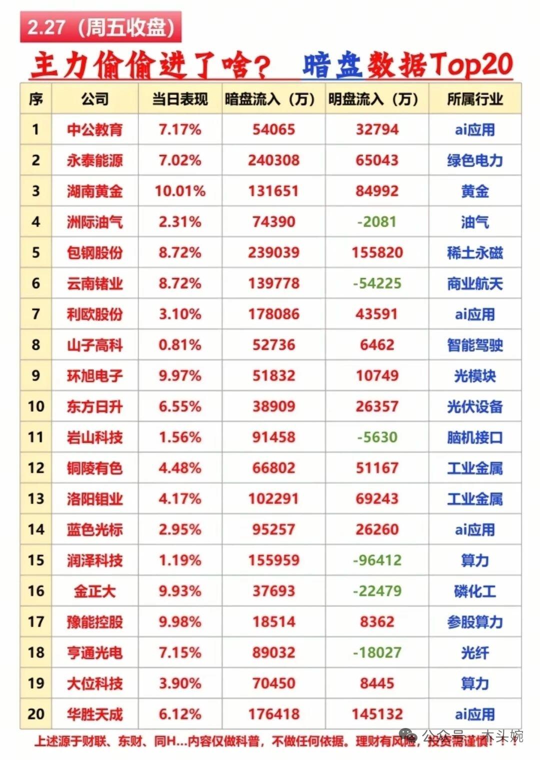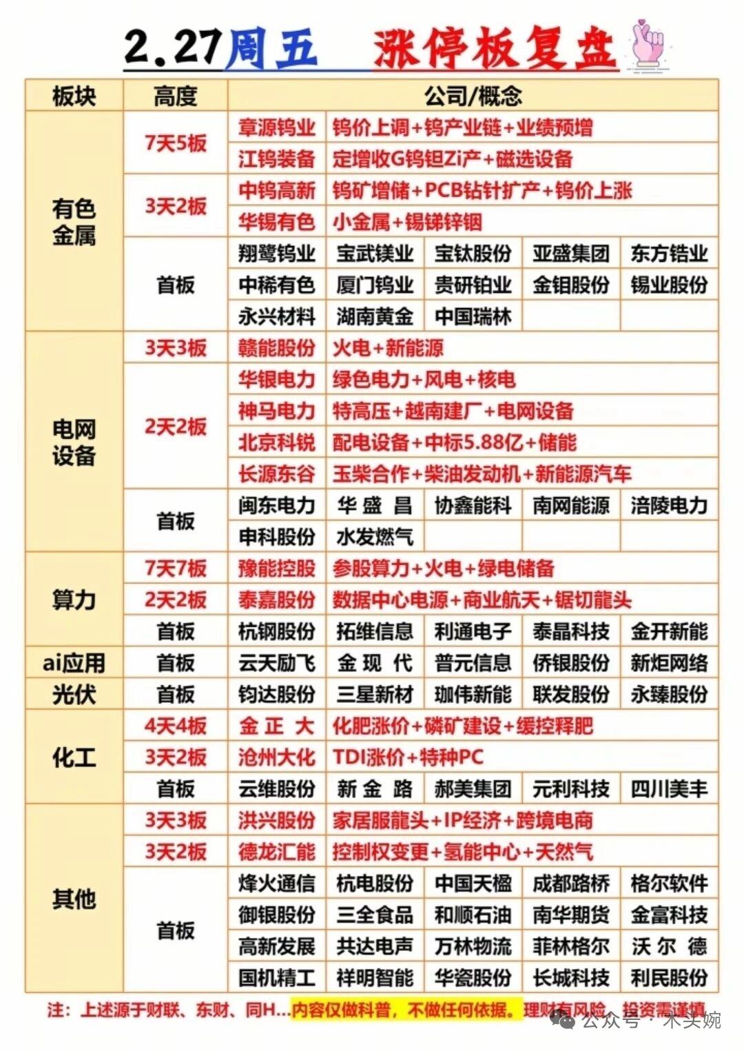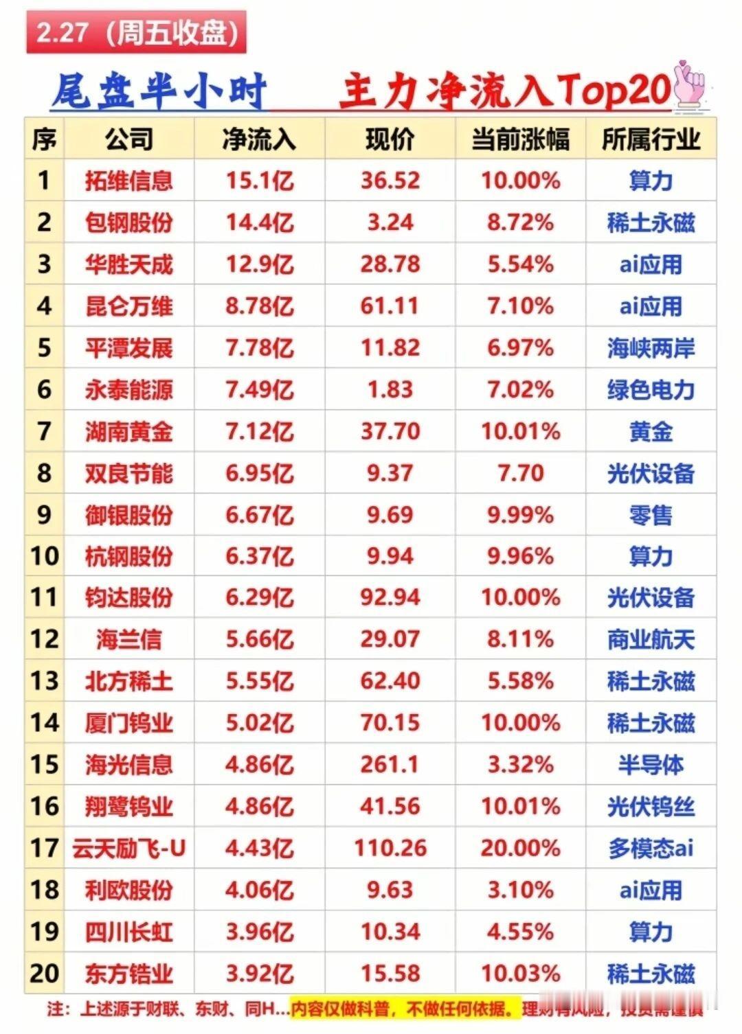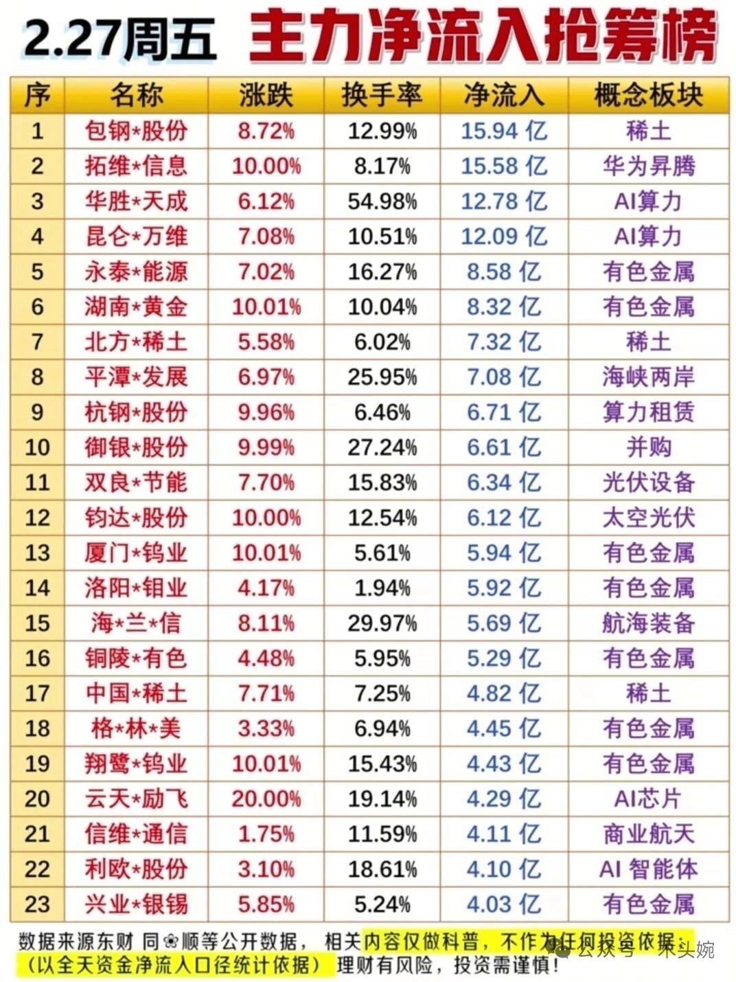 尾盘半小时15亿疯抢!游资大佬重仓名单泄露,谁是下一个龙头2月27日周五收盘,主力资金动向全解析! 周五全天抢筹榜与尾盘半小时净流入Top20同步出炉,AI算力、稀土永磁、光伏设备等赛道成吸金主力,包钢股份、拓维信息等多股获主力重金布局。 2.27周五涨停复盘:有色金属、电网设备、算力三大主线强势领涨! 钨价上涨引爆有色板块,章源钨业7天5板;电网设备板块,赣能股份7天7板,华银电力等连板晋级;算力与AI应用热度不减,拓维信息、云天励飞等获资金追捧;化工、家居等板块也有个股强势突围。 游资大佬操作也同步曝光,北京知春路、成都系等席位精准出击,华胜天成、云天励飞等标的备受青睐。 市场主线清晰,资金动向暗藏机会,紧跟主力步伐,把握行情脉搏!💡
