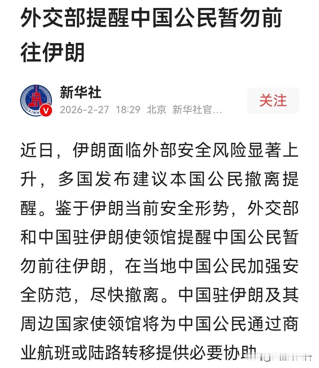 就在刚刚,新华社的一条消息,把中东局势的紧迫感,直接压到了每个人的心头。 消息说得直白,没有半句虚言。 当前安全形势下,中国公民暂勿前往伊朗。 已经在当地的人员,请尽快撤离。 不止中国。 澳大利亚、印度、韩国等多个国家,早几天就已发出提醒,呼吁本国公民尽快离开伊朗。 这不是常规的安全预警,更像一场静悄悄的撤侨前奏。 德黑兰的空气里,一边是谈判的拉锯,一边是磨刀的寒意。 2月26日,美伊第三轮间接谈判在日内瓦落幕。 伊朗外长阿拉格齐称,谈判有进展,下周将继续。 可谈判桌的另一边,美军的动作一刻没停。 F-22隐形战机正分批调往以色列。 “福特”号航母从希腊出发,即将赶赴中东,与“林肯”号组成双航母编队。 2月27日当天,美军中央司令部司令库珀,还在向特朗普汇报针对伊朗的军事选项。 从有限打击到大规模轰炸,所有方案都已摆在台面上。 伊朗也没有半分退让。 伊朗武装部队发言人明确表态,美国的任何挑衅,都会遭到果断且毁灭性的回击。 两边嘴上都留着谈判的余地,手里却都攥紧了武器。 这样的局面,最容不得半点擦枪走火。 国际原子能机构前总干事巴拉迪说得直白。 美国正在加快针对伊朗的战争鼓点,却没有给出任何动用武力的法律依据。 这句话戳中了最核心的问题。 开战的理由是什么?打完之后如何收场? 没有人能给出答案。 此刻最难的,是留在伊朗的普通人。 他们是工程师、商人、留学生,原本只是在异国他乡讨生活、过日子。 一夜之间,局势陡变,回家的路忽然变得不确定。 当地的中资机构也在两难。 是让员工立刻撤离,还是再观望几天? 商业航班还在运行,陆路口岸也还能通行。 可谁也不知道,这个安全的窗口期,还能留多久。 中国驻伊朗、驻迪拜、驻伊拉克的使领馆,此刻的领保电话大概率一直占线。 外交部已经把周边国家的领保联系方式全部列出。 阿塞拜疆、亚美尼亚、土耳其、卡塔尔,所有能走的撤离路线,都给大家指得明明白白。 剩下的选择,只能由身处当地的人自己做。 这场危机,核心绕不开核问题,背后是无数人的身家性命。 对于还留在当地的中国公民来说,再复杂的地缘格局,再紧张的大国角力,都比不上一张能平安回国的机票。 这场美伊对峙,表面是核问题谈判,实则是两支疲惫的队伍,在玩一场“谁先眨眼”的耐心游戏。 特朗普一边调兵遣将,一边留着谈判的窗口,还是当年极限施压的老办法。 伊朗则咬死铀浓缩的权利不松口,用拖延换取更多空间。 可双方都有自己的软肋。 美国怕再次陷入中东的战争泥潭,伊朗扛不住长期制裁的压力。 真正危险的,是被局势裹挟的第三方。 以色列的冲动,一次误判引发的擦枪走火,都可能让谈判桌瞬间化为废墟。 眼下的僵局,最缺的不是解决方案,是能让双方都体面下台的台阶。