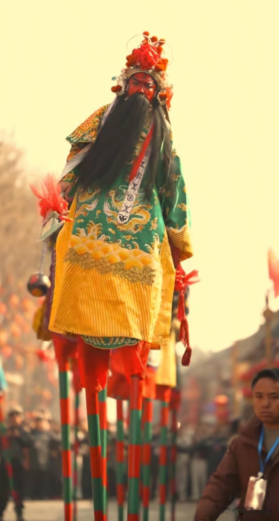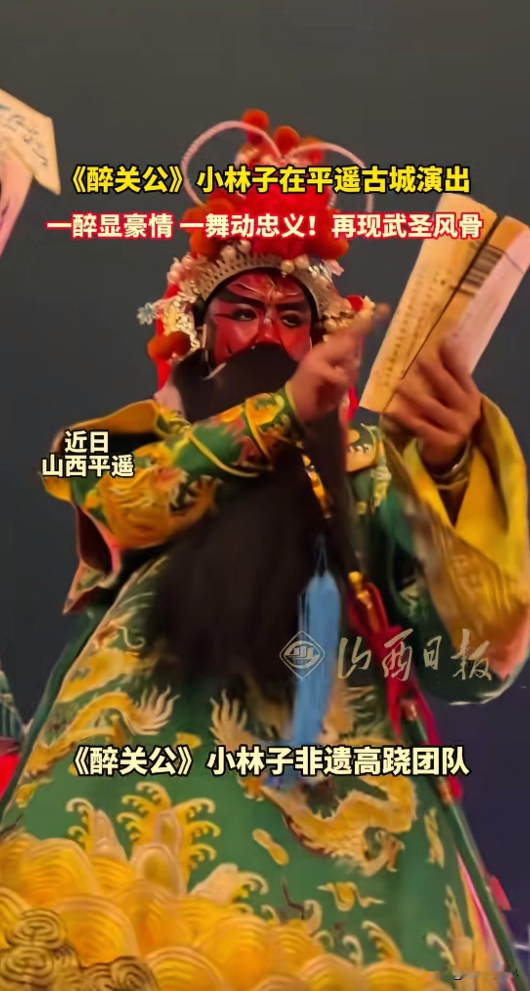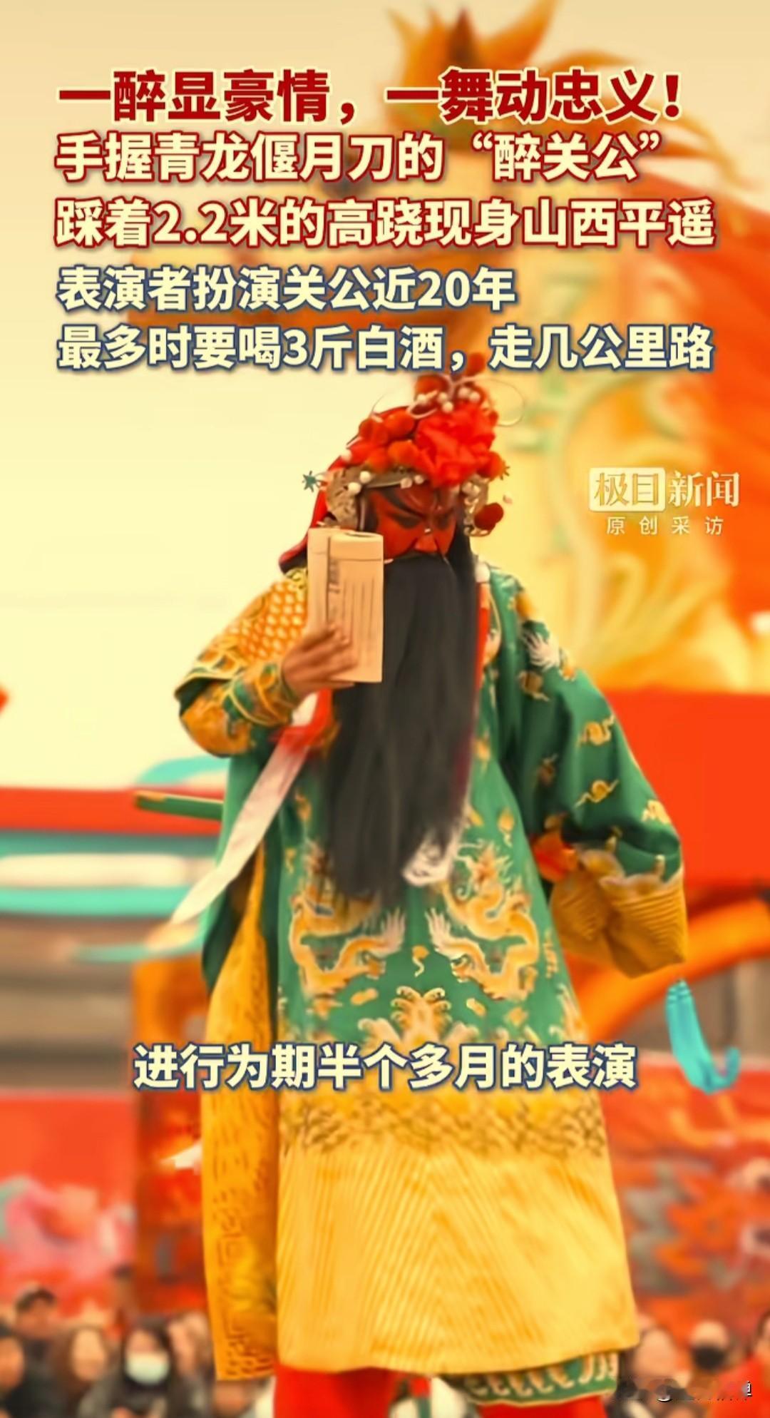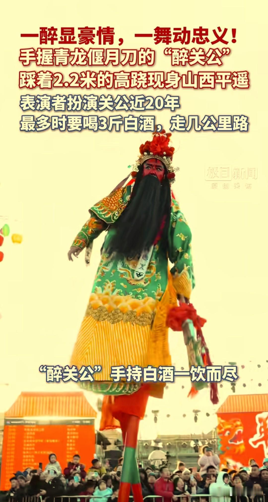 甘肃娃小林子平遥炸场!踩2.2米高跷豪饮3斤酒,‘醉关公’火遍全网 连日来,山西平遥古城街头万人空巷!来自甘肃的“醉关公”小林子(段国林)受邀在此进行震撼表演。 他身穿绿衣、脸涂枣红,手握青龙偃月刀,踩着2.2米的高跷,仰头饮尽坛中白酒,在万众瞩目下翩然起舞。这,就是非遗高跷表演——《醉关公》。 将关公的豪迈与悲悯演活了,他步伐踉跄却稳如泰山,时而挥刀破阵,时而深情抚慰,现场无数观众被其神韵感染落泪。 扮演者段国林(小林子)37岁,来自“关公世家”,有20年经验。表演时他还会豪饮52度白酒,最多能喝3斤并踩着高跷走几公里。 据悉,本次演出将持续至正月十五,他和团队在平遥进行为期半个多月的展演,每天都吸引着大批游客和市民围观。这位“行走的表情包”已在抖音狂揽千万播放! 醉关公高跷团队 社火表演醉关公 关公林子