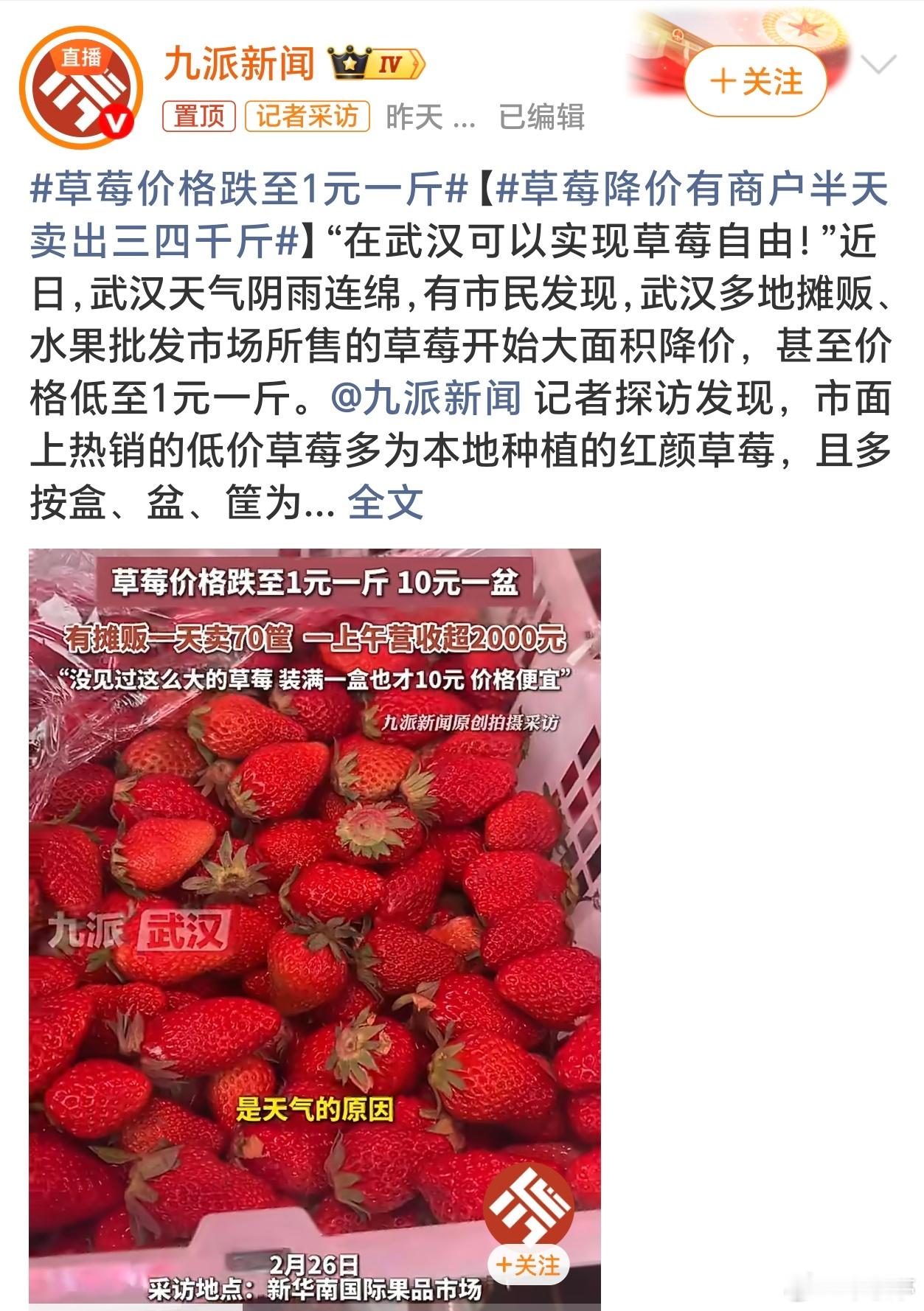 草莓价格跌至1元一斤1元基本是品质差的、个头小的果!我们这里优点草莓价格还是不低的,基本不低于10元!