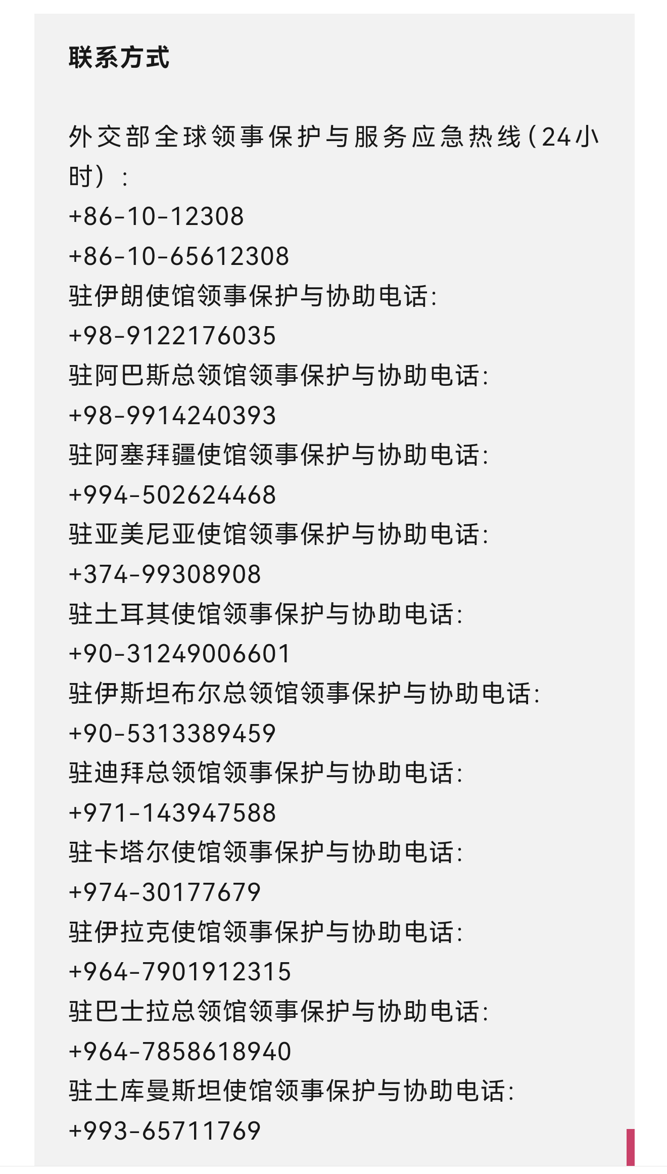 外交部全球领事保护与服务应急热线(24小时): +86-10-12308 +86-10-65612308 驻伊朗使馆领事保护与协助电话: +98-9122176035 驻阿巴斯总领馆领事保护与协助电话: +98-9914240393 驻阿塞拜疆使馆领事保护与协助电话: +994-502624468 驻亚美尼亚使馆领事保护与协助电话: +374-99308908 驻土耳其使馆领事保护与协助电话: +90-31249006601 驻伊斯坦布尔总领馆领事保护与协助电话: +90-5313389459 驻迪拜总领馆领事保护与协助电话: +971-143947588 驻卡塔尔使馆领事保护与协助电话: +974-30177679 驻伊拉克使馆领事保护与协助电话: +964-7901912315 驻巴士拉总领馆领事保护与协助电话: +964-7858618940 驻土库曼斯坦使馆领事保护与协助电话: +993-65711769