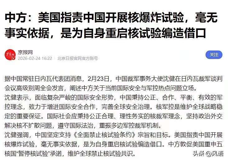 日内瓦核谈判,美国避开俄罗斯,拿中国说事,企图一箭双雕。 就核武器谈判来说,那是美俄的事,两国核武数量均超过5000件,其它国家不及零头,能把全人类毁灭好几十次。 因此,就核武器谈判,是各国对这两国提要求,但是,美国反其道而行之。 美国称,中国扩充了核武库、秘密搞了核实验,还编造了核武库数据。这都是子虚乌有的事,美国毫无证据,但它却把这事摆上桌面,摆明是“莫须有”。 因为就核武器来说,这是它对中国为数不多的优势之一,但这优势不会太久,美国认为,到2030年,就会超过一千件,假以时日,美国在核武器方面将面对两个同体量的国家。 美国“莫须有”很毒,往大点说,他们曾对多国用过,像伊拉克等国为了自证清白,“剖腹证粉”,结果被渗透的国际原子能机构把伊拉克摸了透,萨达姆的办公桌下都被他们装了GPS信标。 今天的日内瓦,美国不再是顶峰时的灯塔国,中国更不是伊拉克,想让中国“证粉”是不可能的,在这里,美国所希望的只能是求小,借机废除《全面禁核实验条约》,重开核实验,为其新型核武器的制造创造条件。 当然,美国还有一个中等的目的,那就是把中国纳入核裁军,这样,既稳住了俄罗斯,还绑住了中国,可谓是一箭双雕,但这一点,中国不会上当。