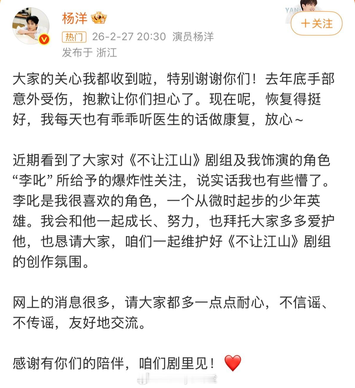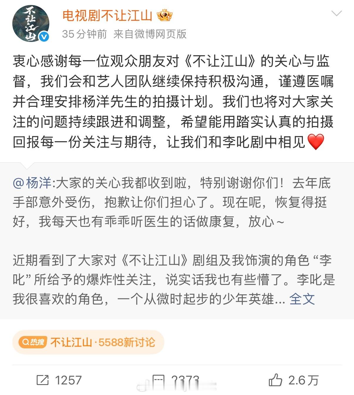 杨洋发文回应不让江山争议 杨洋发文呼吁大家一起维护剧组的创作氛围,能看出来杨洋真的很喜欢李叱这个角色。同时剧组也表明了态度,会对问题持续跟进和调整,希望能说到做到,将改动落到实处,回应一个好演员的用心付出!