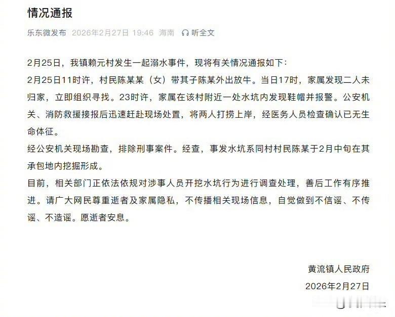 痛心!母子放牛一去不返,坠入私挖水坑双双溺亡,官方通报来了 一场再平常不过的放牛,竟成永别。海南乐东一对母子,在自家村子附近意外坠入水坑,两条鲜活生命瞬间消逝,看完通报,无数人破防。 2月25日上午11点左右,海南乐东县黄流镇赖元村,村民陈某某带着年幼的儿子像往常一样外出放牛。家人以为只是一次普通的外出劳作,谁也没料到,这一去就再也没能回来。 当天下午5点,家属见母子迟迟未归,心里发慌,立刻发动亲友四处寻找。从白天找到深夜,直到晚上11点多,家人才在村边一处水坑旁发现了母子的鞋帽,不祥的预感瞬间压垮所有人。 报警后,消防、公安火速赶到现场搜救,最终将母子二人打捞上岸,但医护人员确认,两人已无生命体征。 经警方现场勘查,排除刑事案件,这不是人为伤害,却是一场更让人意难平的“人为隐患”悲剧。 官方通报明确:事发水坑,是同村村民陈某,在2月中旬才在自己承包地里私自挖出来的。 更戳心的细节曝光:孩子先不慎失足坠坑,母亲看见孩子落水,第一时间冲过去施救,可水坑又深又险,母亲非但没能把孩子拉上来,自己也一同被困,最终母子双双遇难。 一边是本能救子的伟大母爱,一边是毫无防护的夺命深坑,对比之下,让人泪崩又愤怒。 从法律角度看,这起事件的责任非常清晰: 1. 村民在承包地内私自挖掘深坑,未设置任何警示标志、未做围挡防护,对周边村民构成严重安全隐患,属于明显过错。 2. 私挖农田、擅自改变土地用途,涉嫌违反土地管理相关规定,相关部门已对开挖行为依法调查处理。 3. 参照同类判例,因私挖水坑、未采取安全措施导致他人伤亡,开挖人需承担民事赔偿责任,情节严重还可能涉及刑事责任。 这不是“意外”,是本可避免的责任事故。 一条田埂,一个水坑,毁了一个完整家庭。我们心疼那位奋不顾身的母亲,更痛恨那些无视安全、私挖乱建的行为。土地是自家的,但安全是大家的,你随手挖的一个坑,可能就是别人的生死关。 愿逝者安息,愿严查责任、全面排查隐患,不要再让类似悲剧发生。 你觉得,私挖水坑致人死亡,应该承担怎样的责任?