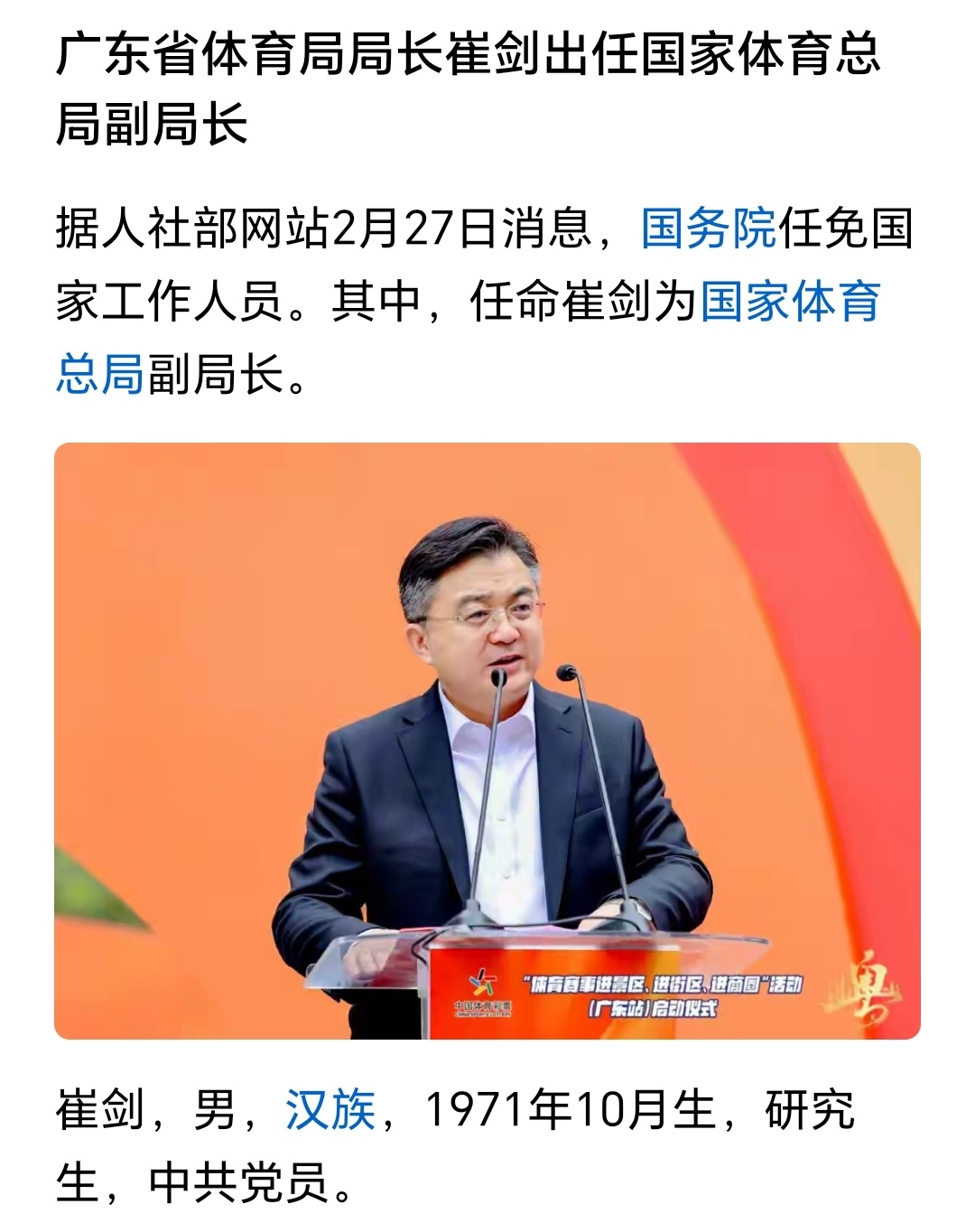 广东省体育局长崔剑被任命国家体育总局副局长。请篮球球迷知悉中国男篮vs日本男篮篮