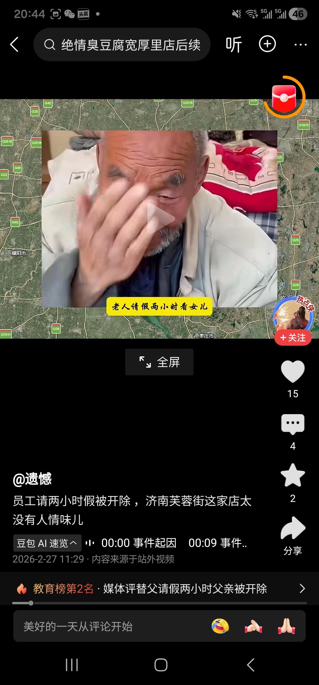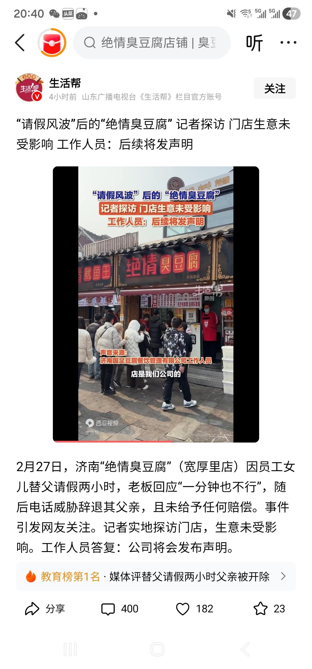 “绝情臭豆腐”,不管怎么说,这波流量是稳了! 自媒体,爆了。 电视台,来了。 54岁员工,春节期间一直上班,结果因为请假2小时,被开了。 其实,从老板的角度看。 这不是2小时的问题! 这是制度和管理的问题。 春节期间, 大家都有事, 你有事请假2小时,老板同意了 他有事请假3小时,老板是同意还是不同意? 都有事的话, 老板的生意还做不做?