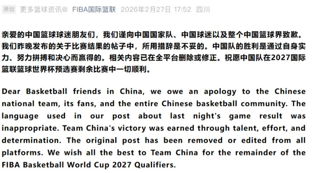 FIBA国际篮联官方向中国男篮道歉。在之前男篮世预赛中国男篮战胜日本男篮的赛后,FIBA国际篮联官方称“中国男篮偷走了一场胜利”引起了中国网友的不满,虽然FIBA国际篮联官方修改了文章,但依旧是被喷的体无完肤。最终FIBA国际篮联官方也是迫于压力发文对中国男篮进行了道歉。 这是迫于金钱的压力吧?毕竟中国可是FIBA的大赞助商。