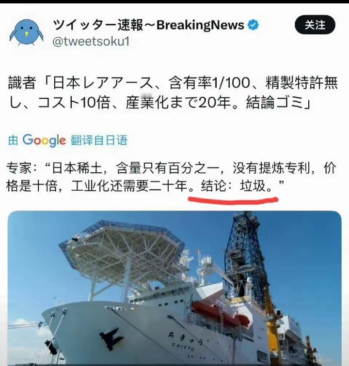 这就是真相, 日本所谓海底开采的稀土,连原材料都算不上,比中国最初级的稀土产品,还要差很多,但价格至少贵10倍, 十几年来,日本在稀土精炼上的进展,几乎是零,今后也不会有变化, 知道最近几个月,中国对日本的制裁项目,一个连着一个,日本却几乎毫无反击吗? 因为日本在大部分高端科技类别上,都已经全面落后于中国,属于中国一掐脖子就翻白眼的状态, 日粉们,还是不要做梦了。