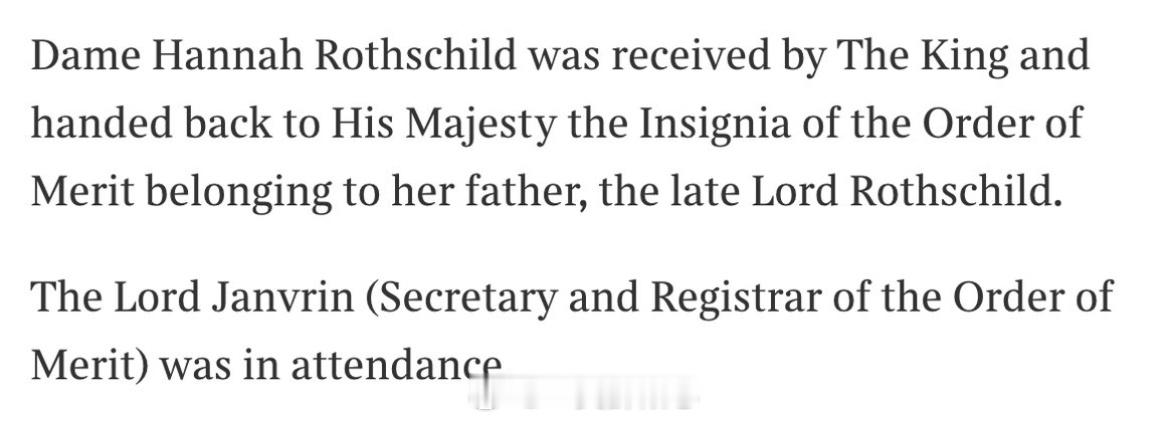 这不就有记录表明,2026年2月26日,世界近代史上最有钱的家族之一罗斯柴尔德家族,已故的罗斯柴尔德第四代男爵雅各布罗斯柴尔德的长女Hannah Rothschild就归还她父亲已于2002年获得的功绩勋章给查尔斯三世。